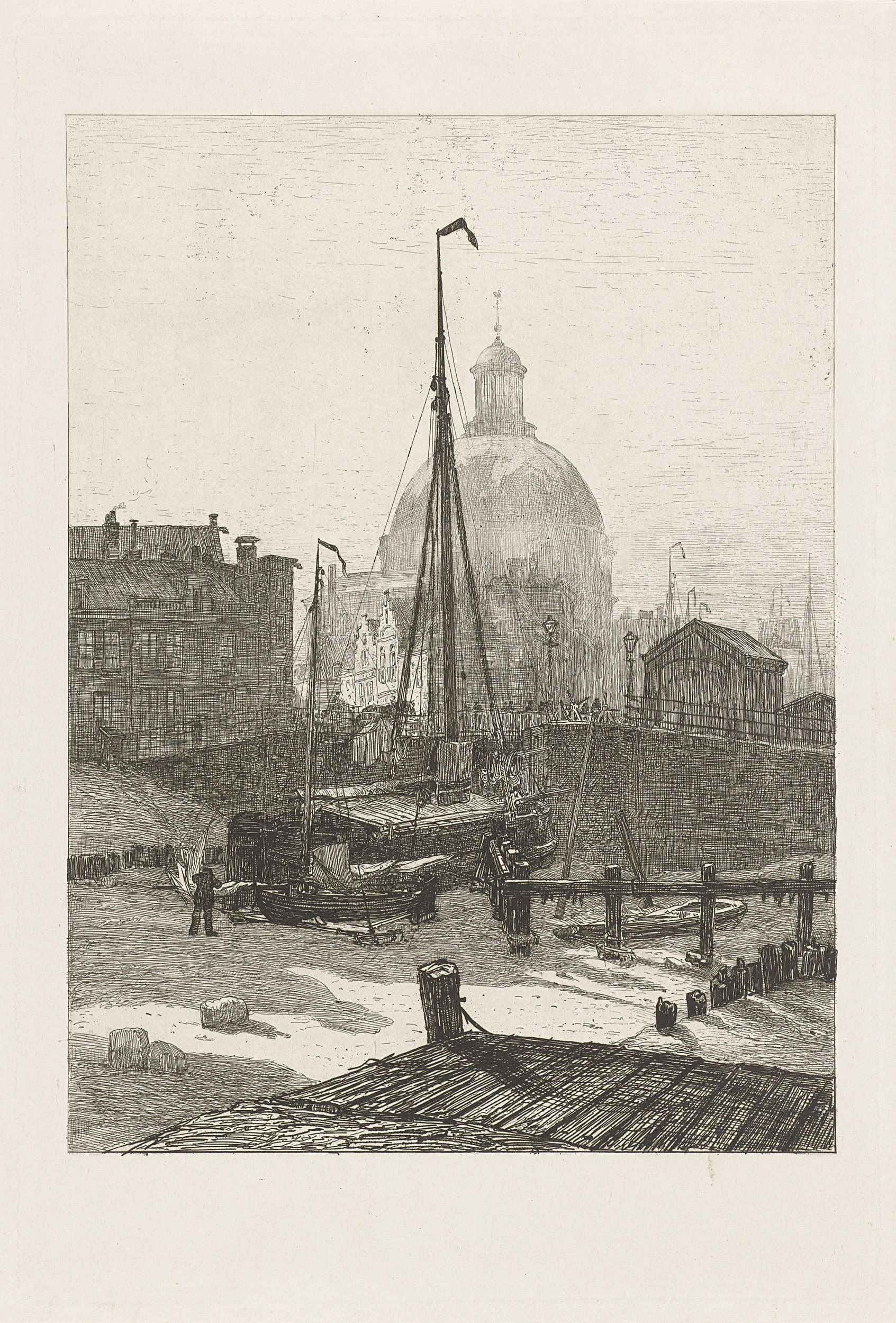 Gezicht op de invaart aan de IJ-zijde van het Singel te Amsterdam met vastgevroren turfpraam. Op de achterfronde de Lutherse Kerk. Voor de praam ligt een ijszeilschuitje.