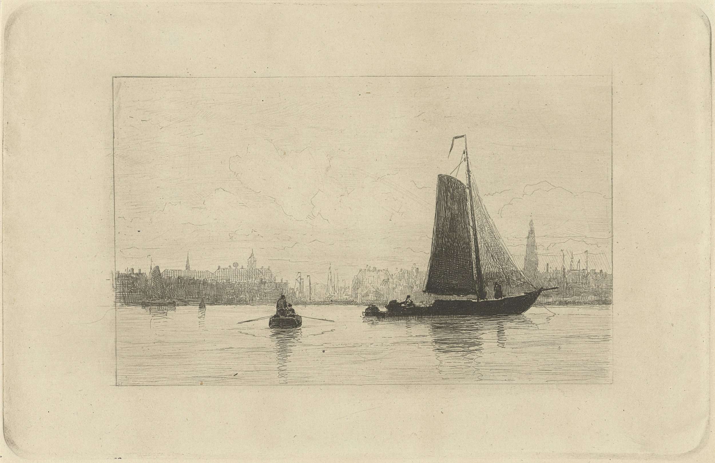 Zeilschip op het water, met op de achtergrond Amsterdam
