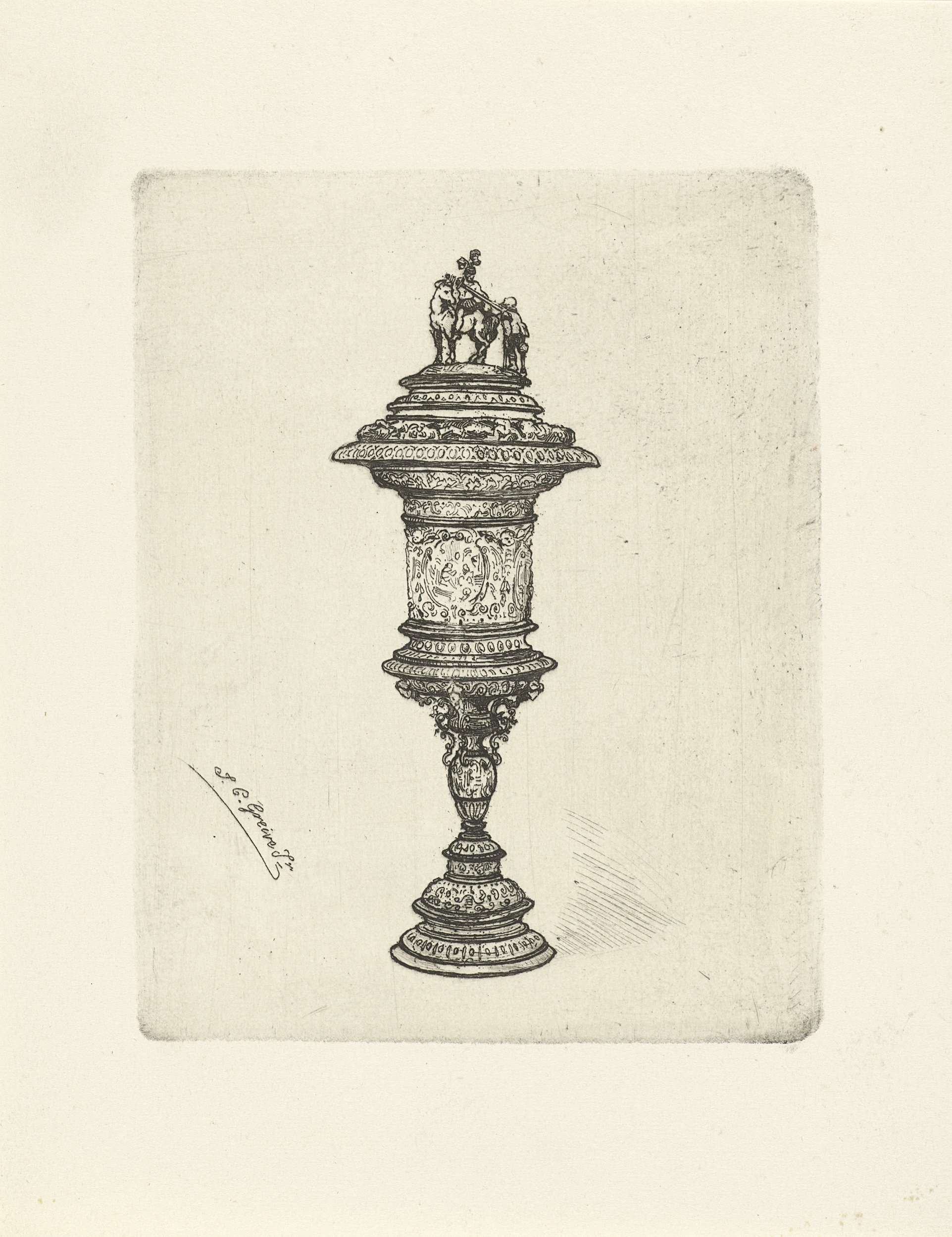 Een ornamentele beker van zilver met op het deksel een voorstelling van de heilige Martinus, die zijn mantel in tweeën snijdt en een deel aan een bedelaar geeft. De beker is van het Sint-Maartensgilde, het brouwersgilde van Haarlem.