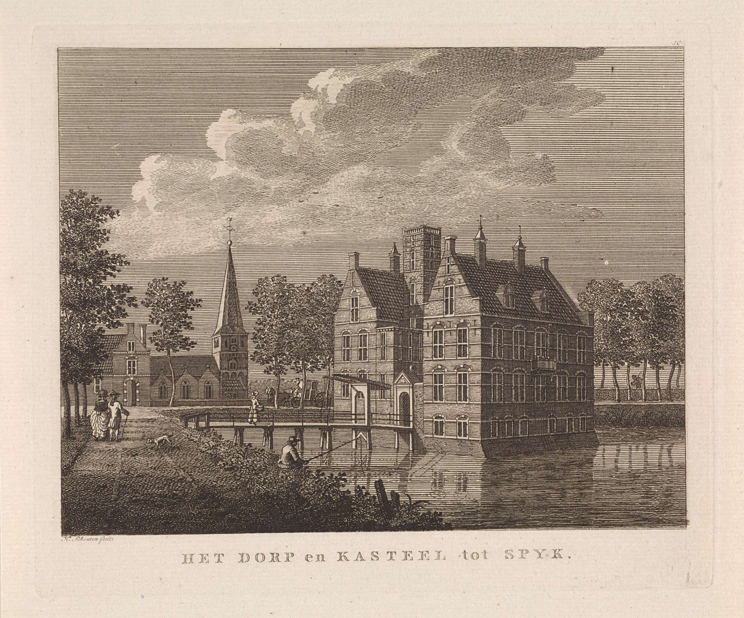 Gezicht op het kasteel en de kerk te Spijk (Lingewaal). Rechtsboven genummerd "10".