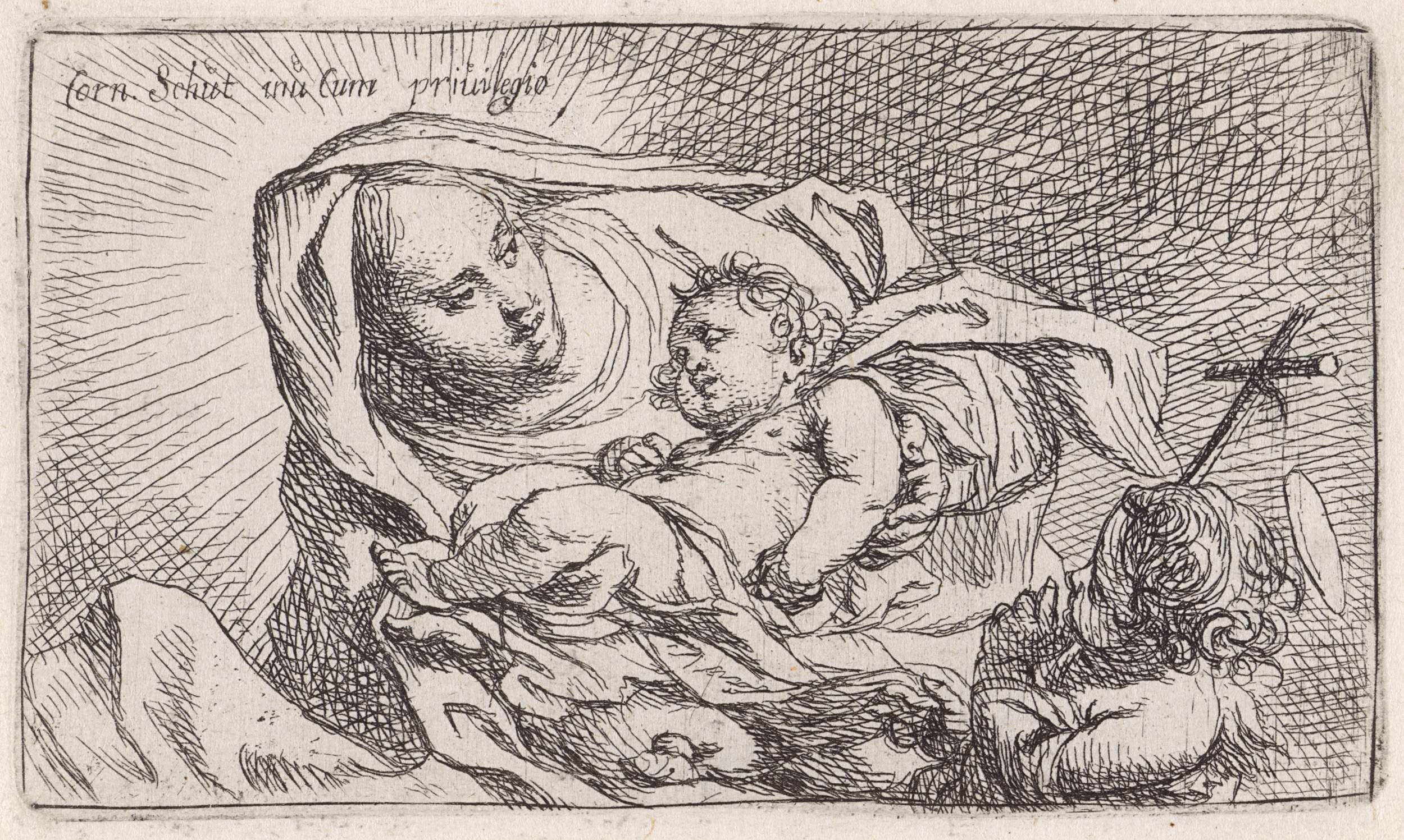 Maria houdt het slapende Christuskind in haar armen. Aan haar voeten staat de jonge Johannes de Doper die een kruis vasthoudt.