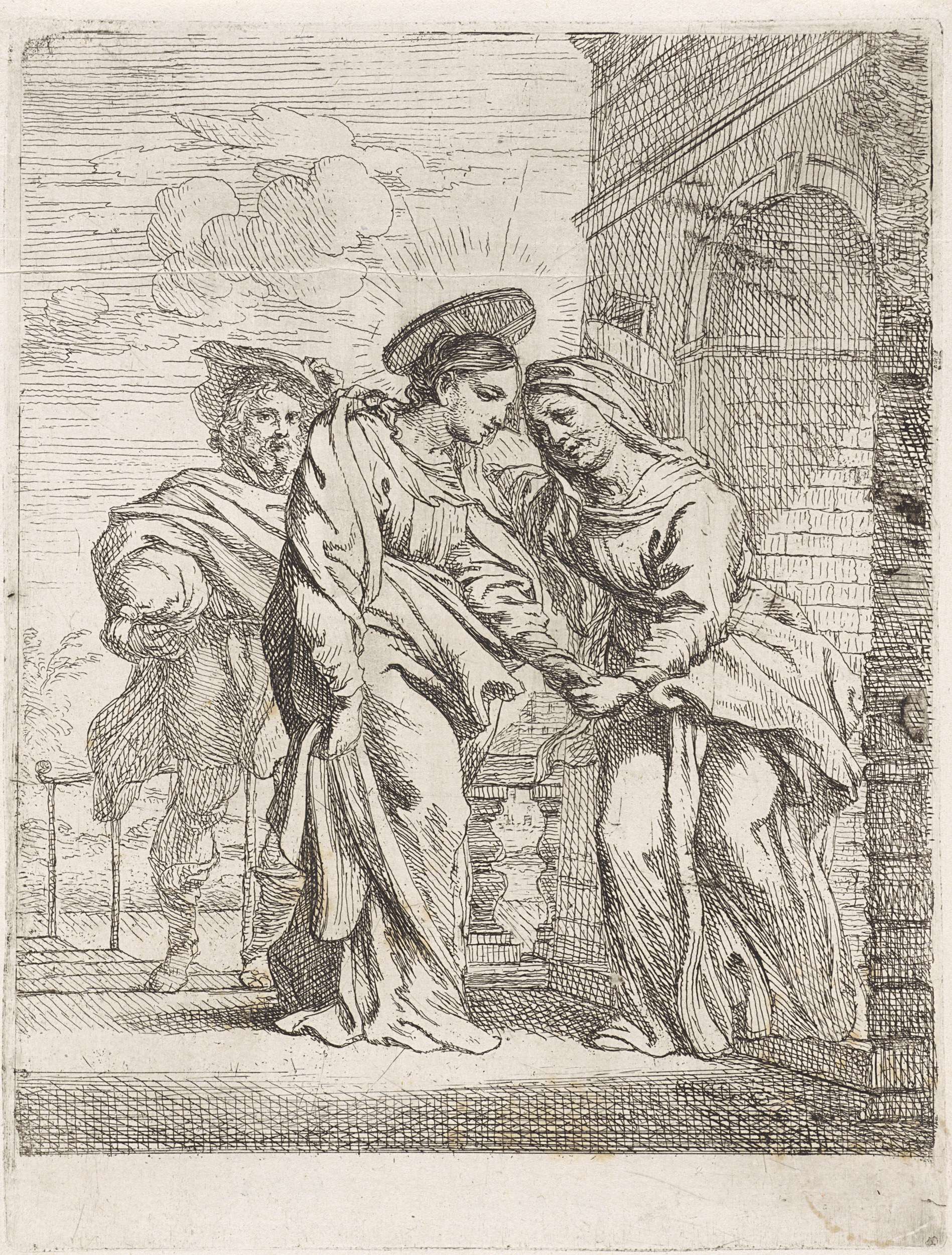 Op de drempel van het huis van Zacharias begroet Elisabet Maria. Zacharias staat op de achtergrond.