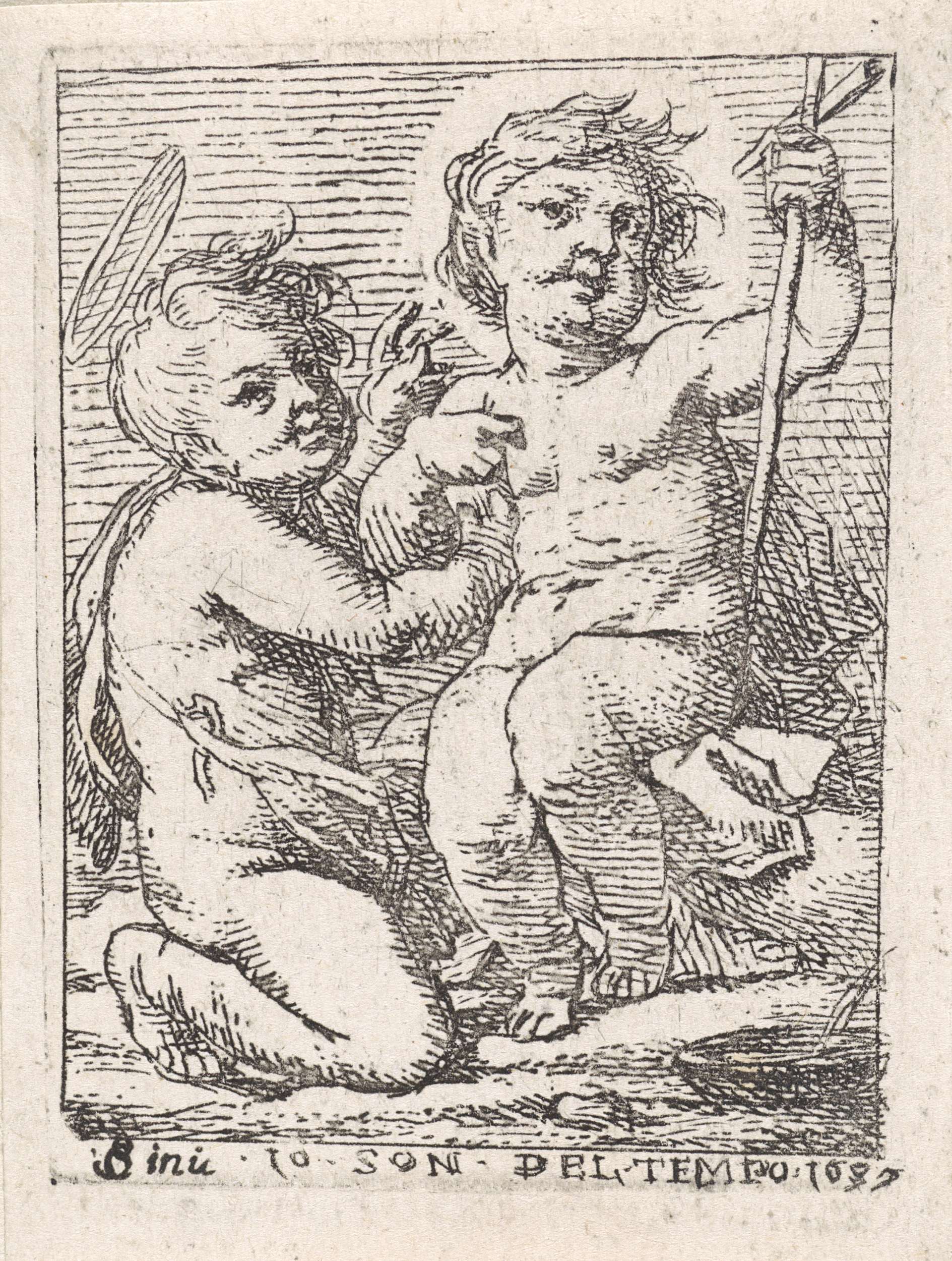 Het naakte Christuskind houdt een kruis vast. De jonge Johannes de Doper houdt hem bij de arm vast. In de marge de tekst 'Io son del Tempo 1632'.