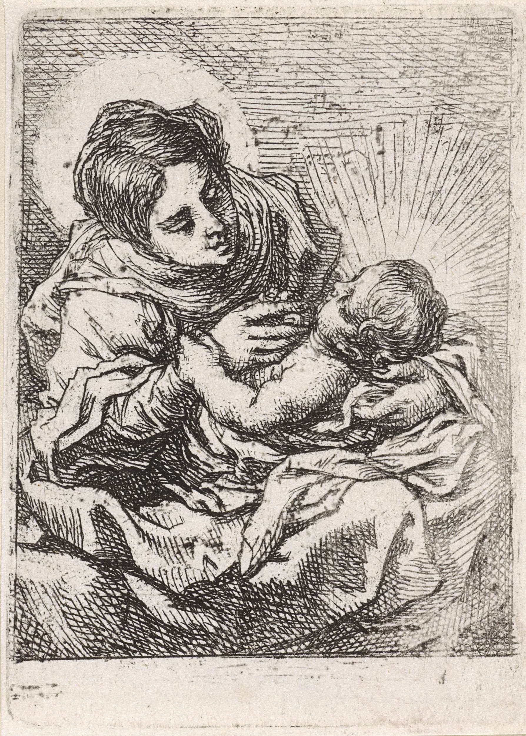 Maria buigt zich over het Christuskind op haar schoot. Het Christuskind houdt haar hand met beide handen vast.