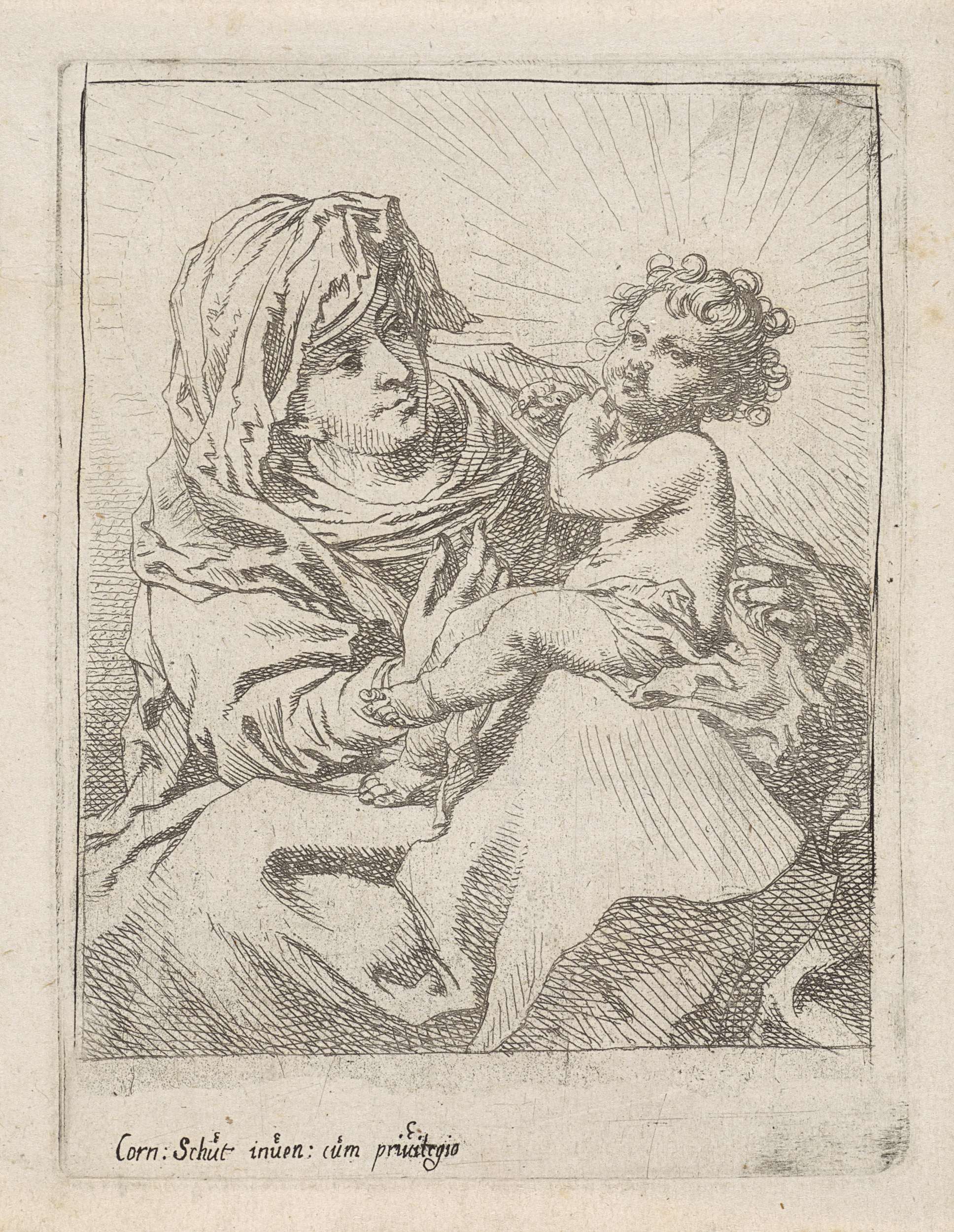Het Christuskind zit op Maria's knie; hij steunt zichzelf tegen haar schouder.