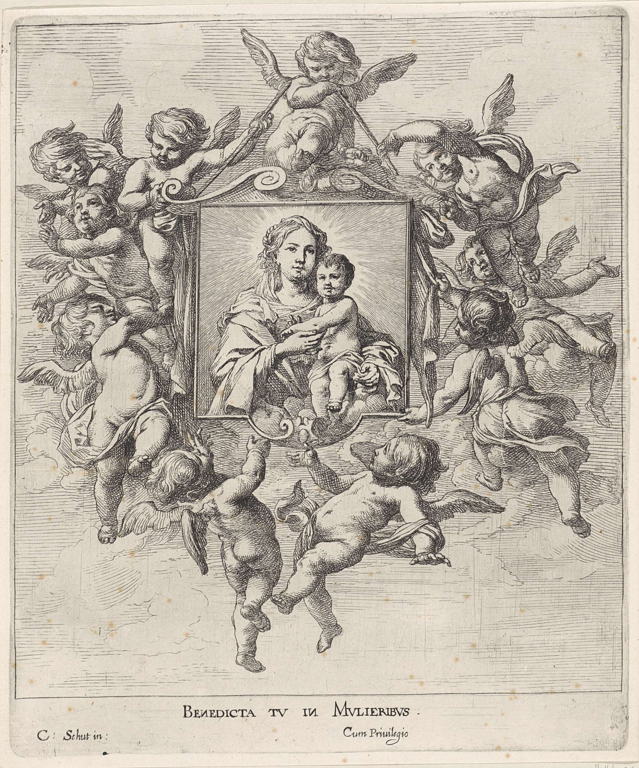 Een afbeelding van Maria met het Christuskind in een cartouche wordt omhooggehouden door een grote groep putti. In de marge de tekst 'Benedicta tu in mulieribus' ('Gij zijt de gezegende onder de vrouwen').