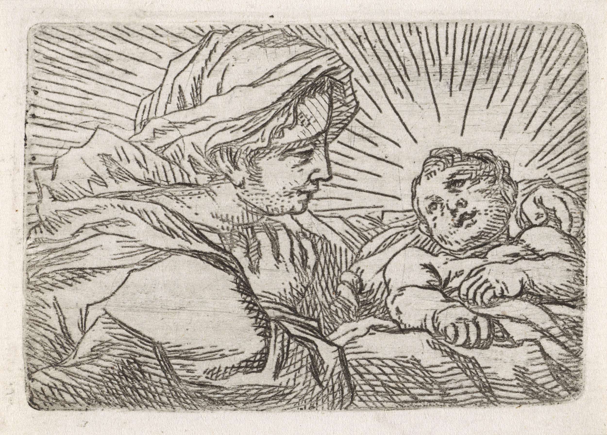 Het Christuskind ligt op een kussen en kijkt op naar Maria, die zijn hoofd met een arm steunt.