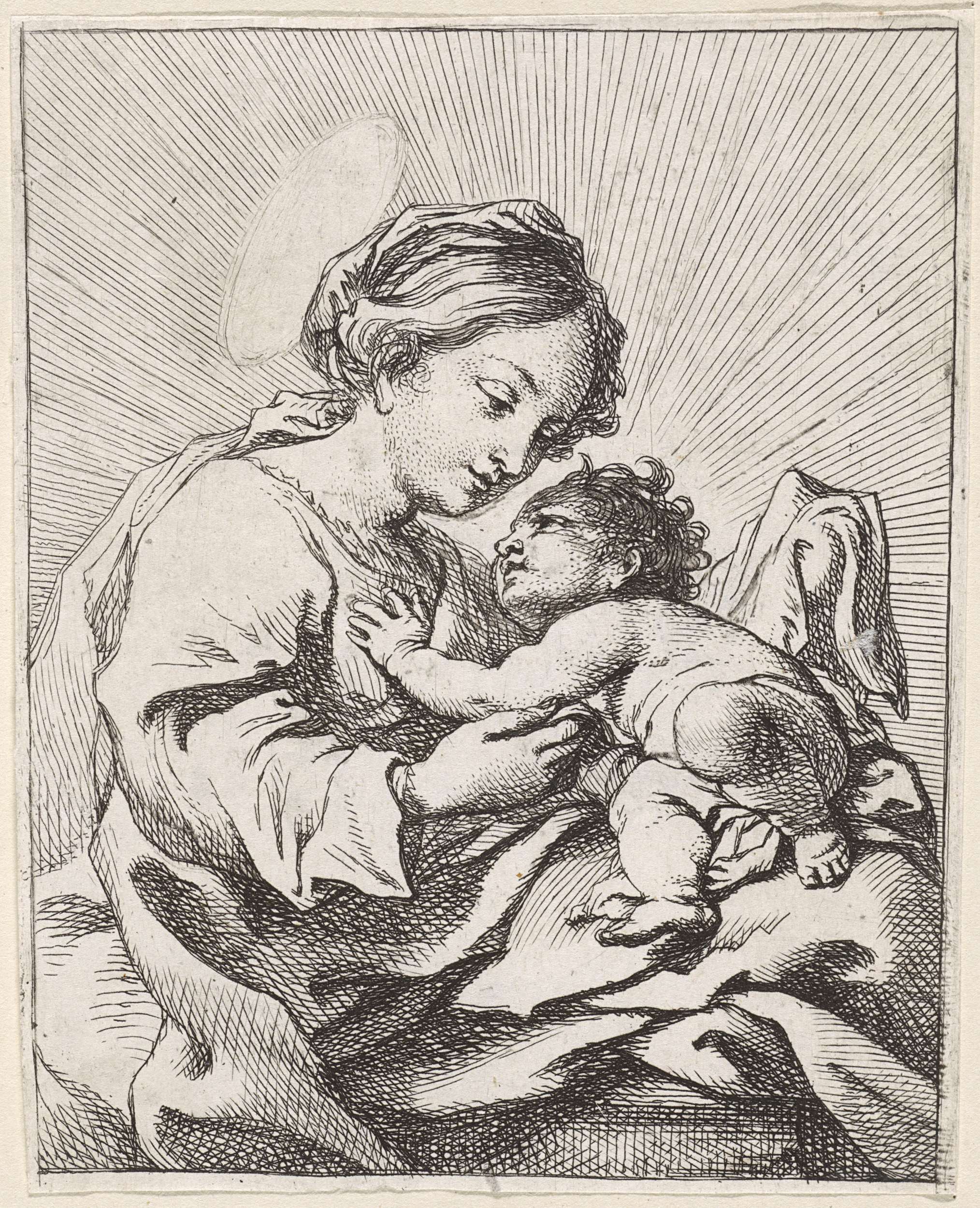 Het Christuskind ligt op schoot bij Maria; hij keert zich naar haar toe.