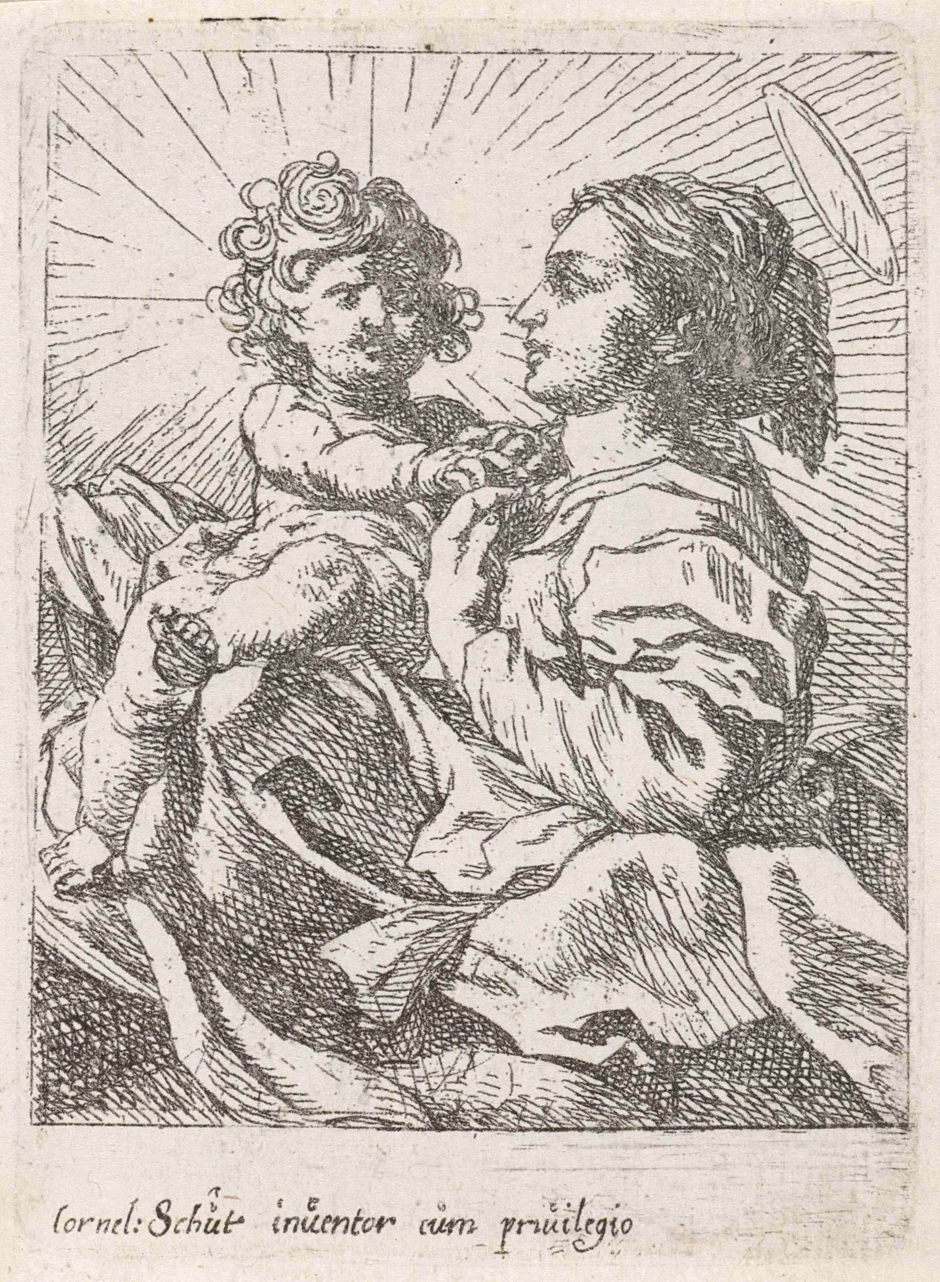 Het Christuskind zit op de hoog opgetrokken knieën van Maria en houdt zijn handen bij haar hals.