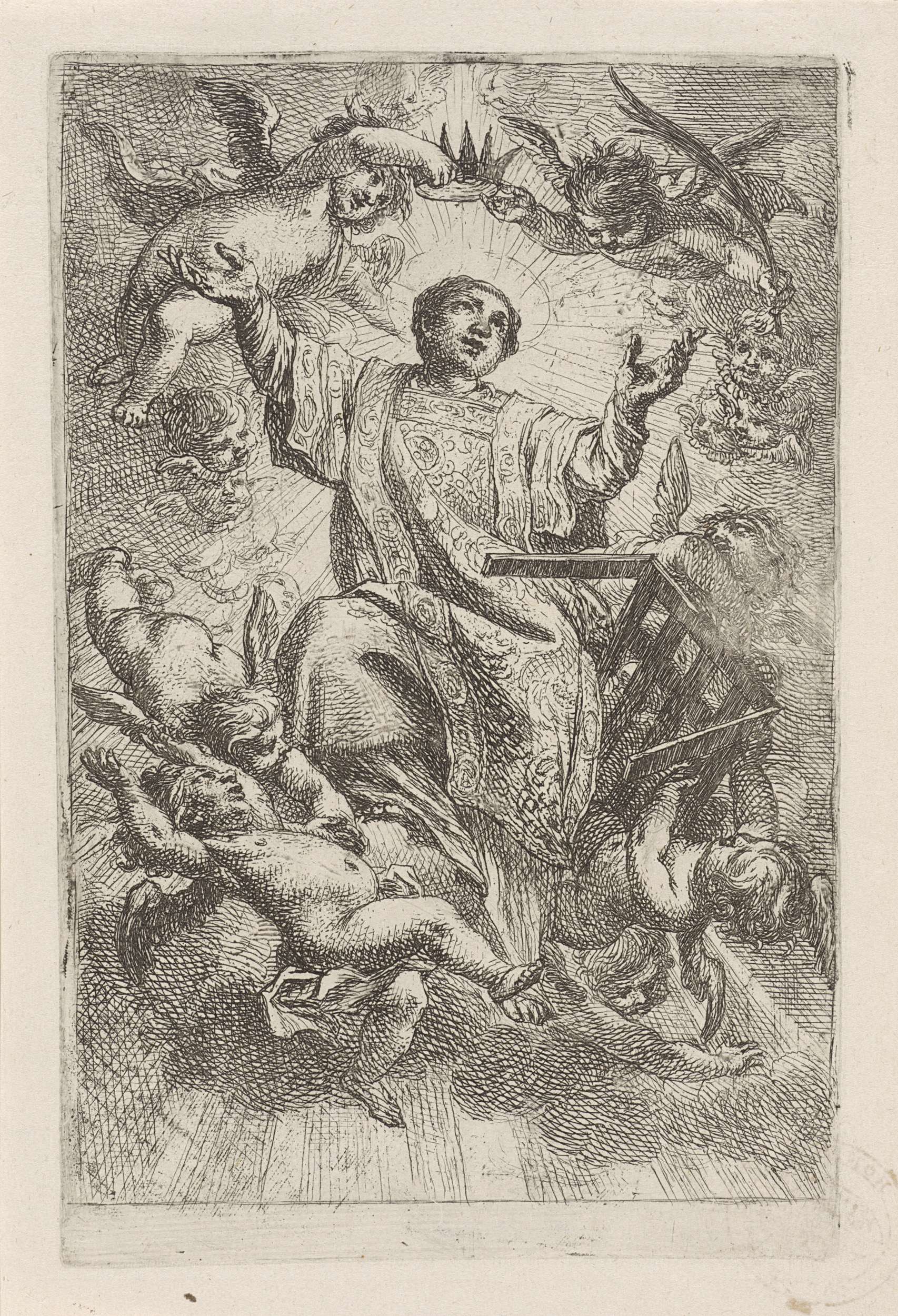 De heilige Laurentius staat op een wolk; hij heft zijn handen omhoog. Het rooster waarop hij gemarteld werd wordt gedragen door een van de putti die hem omringen. Twee putti houden hem een kroon boven het hoofd.