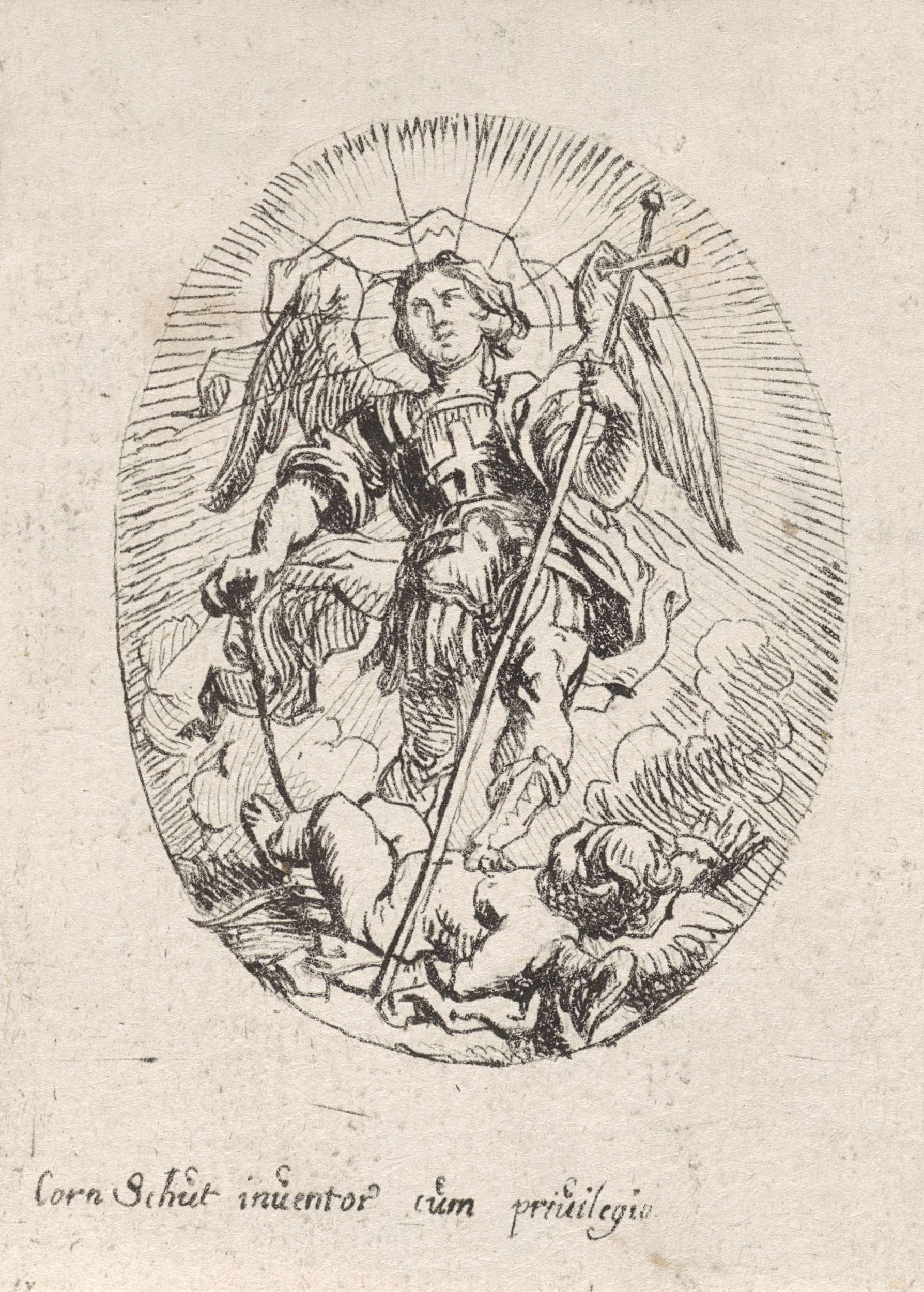 De aartsengel Michaël, met in zijn ene hand een kruis en in de andere hand een ketting, staat met zijn voet op de gevallen engel.