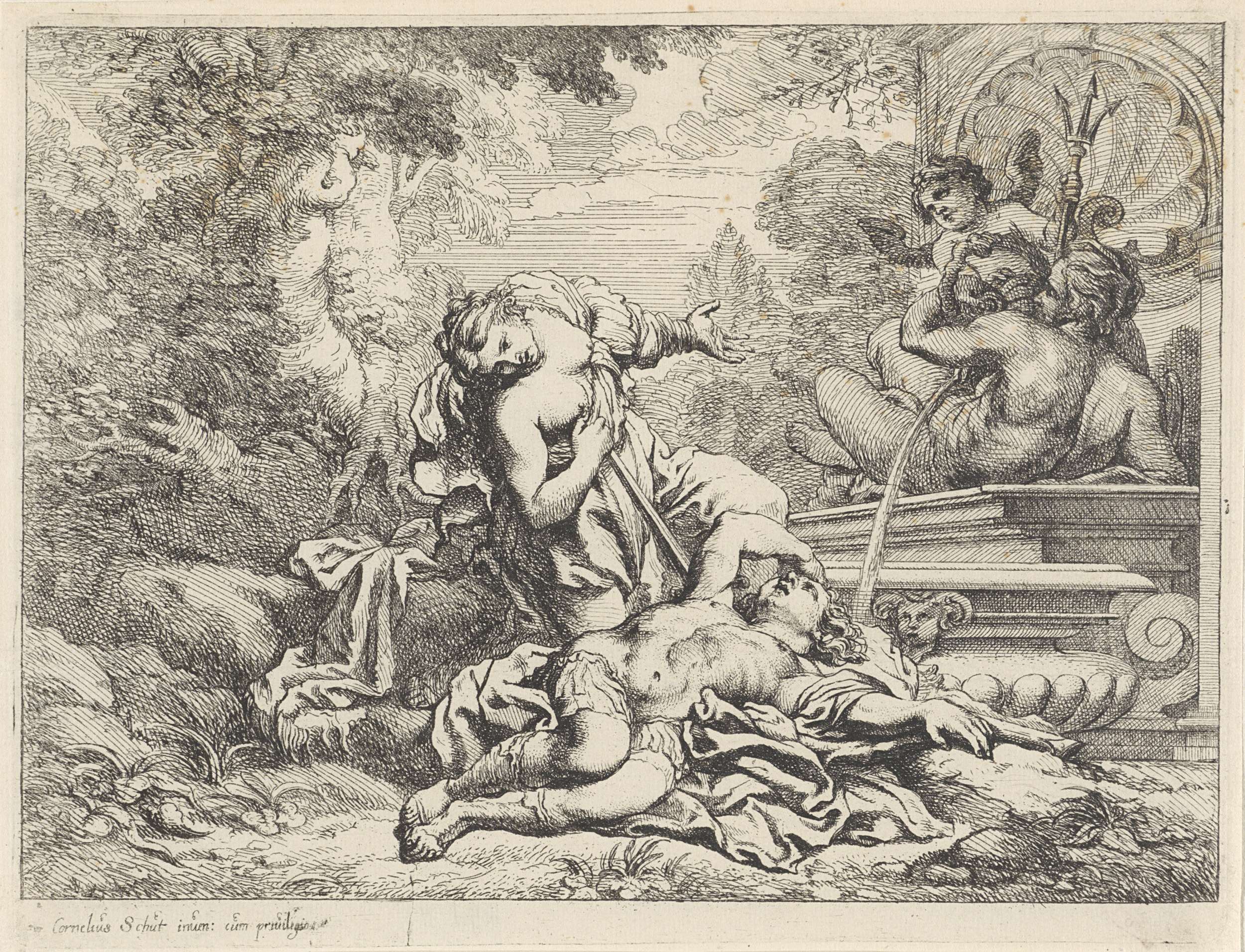 Thisbe stort zich in Pyramus' zwaard, nadat zij haar geliefde stervend aantrof bij de fontein. De besmeurde sluier die leidde tot het misverstand ligt achter haar.