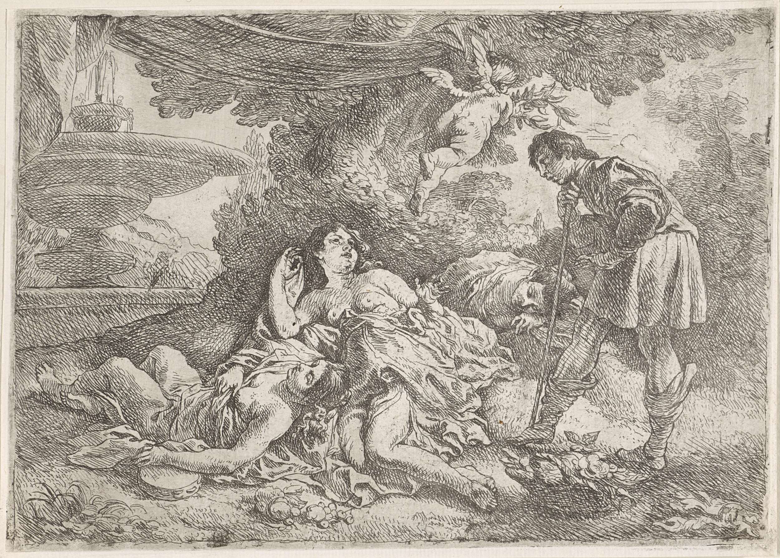 De boerse Cimone kijkt toe hoe Ifigenia en haar gezellinnen liggen te slapen bij de fontein. Ifigenia ontwaakt door zijn blik. (Boccaccio, Decamerone, 5:1).