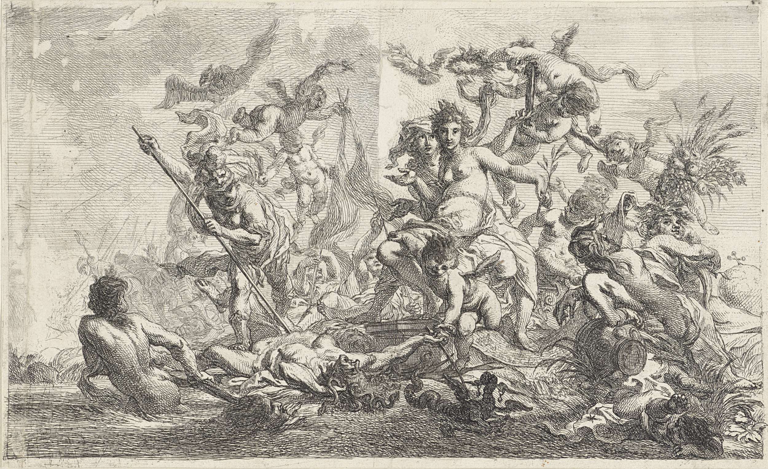 De Vrede zit op een voetstuk met een olijftak in de hand. Links van haar wordt de oorlog verbeeld door vechtende soldaten en Perseus die Medusa spietst. Rechts de vrede met de daaruit volgende voorspoed.