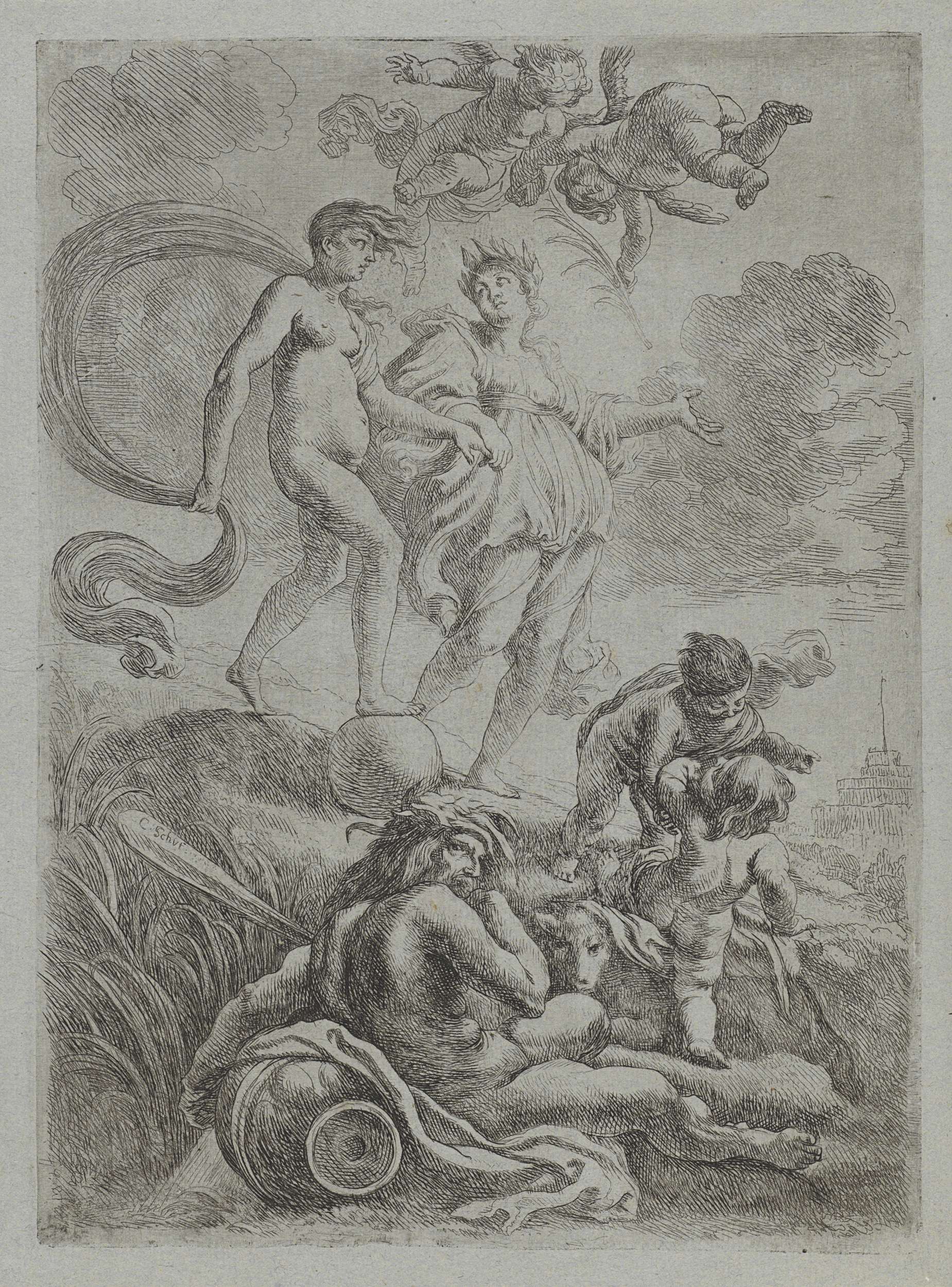 Hollstein Dutch 136 , In tegenstelling tot wat Hollstein aangeeft geen "inv. et f." Weggekrast (resten zichtbaar).