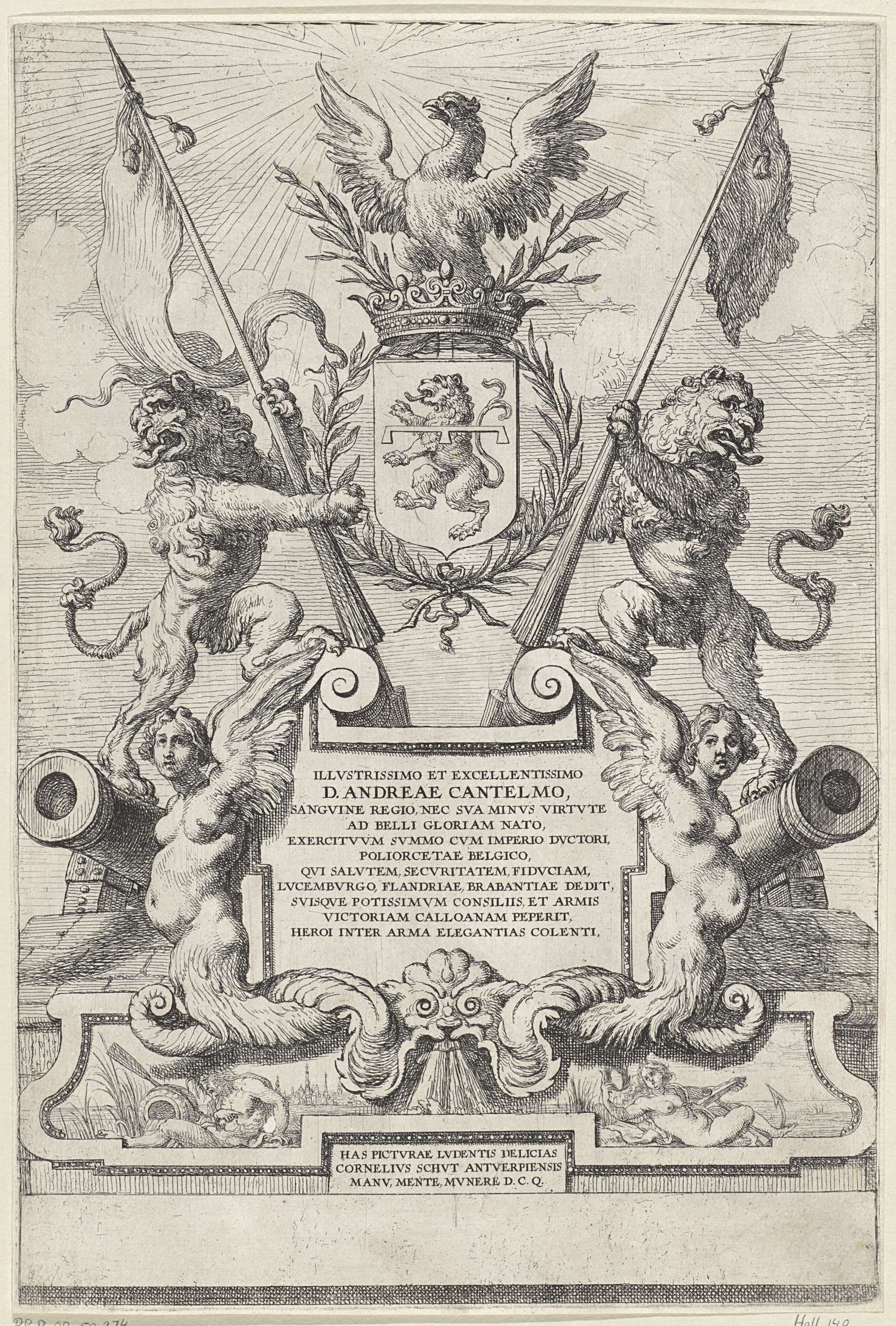 Twee leeuwen houden vaandels op en het familiewapen van de Italiaanse veldheer Don Andrea Cantelmo. Bovenop het gekroonde wapen zit een adelaar. De opdracht, in een cartouche, wordt geflankeerd door twee harpijen en kanonnen. In een cartouche onderaan een riviergod en een nimf met op de achtergrond de stad Antwerpen.
