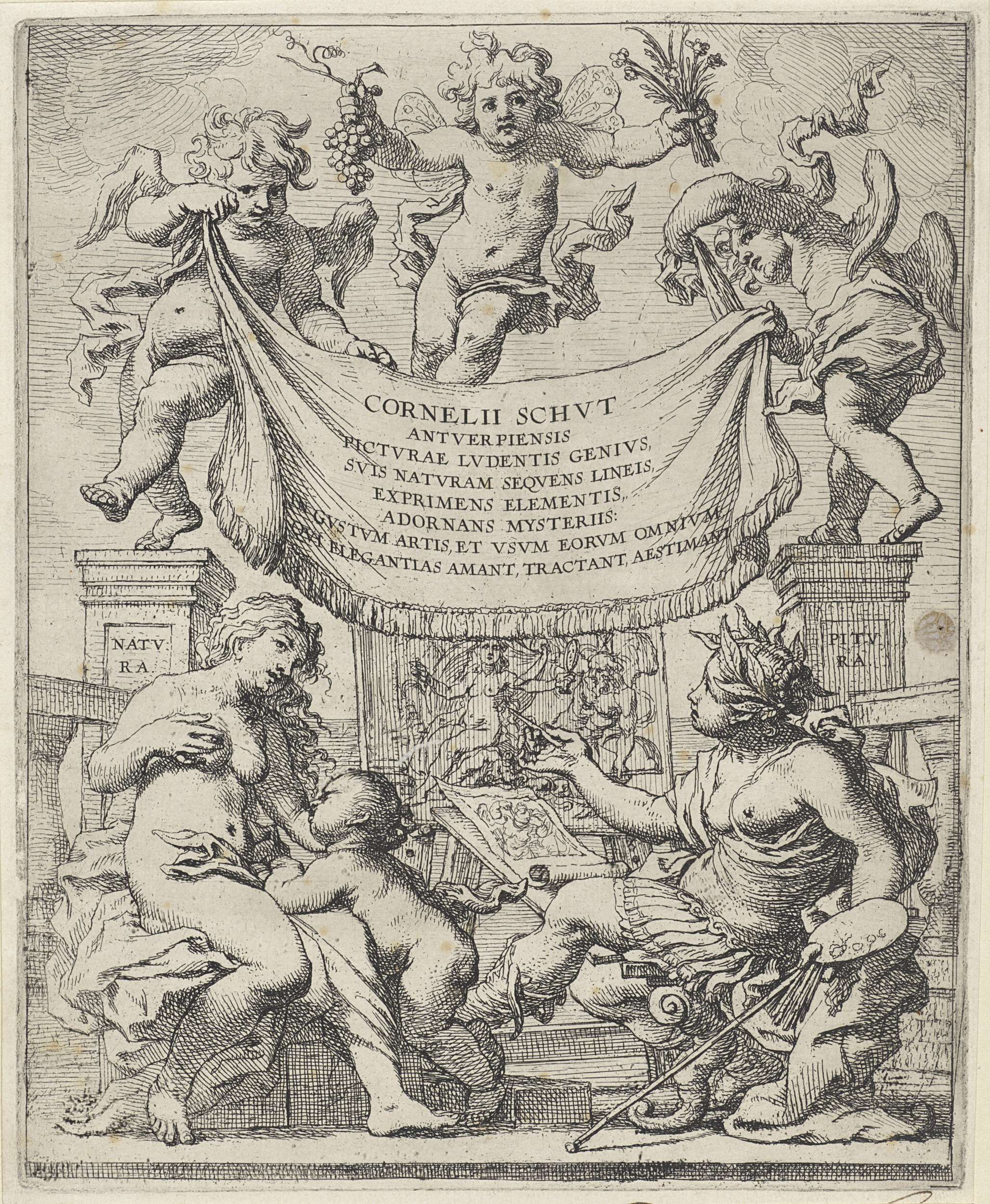 Rechts symboliseert een schilderende vrouw de Schilderkunst. Zij werkt aan een schilderij met Fortuna en de Tijd. Links knijpt een kind zijn ogen dicht voor de toeschietende melk van Natura. Putti houden een vaandel op met daarop een wervende tekst in het Latijn voor de prenten van Cornelis Schut. Bedoeld als titelpagina?