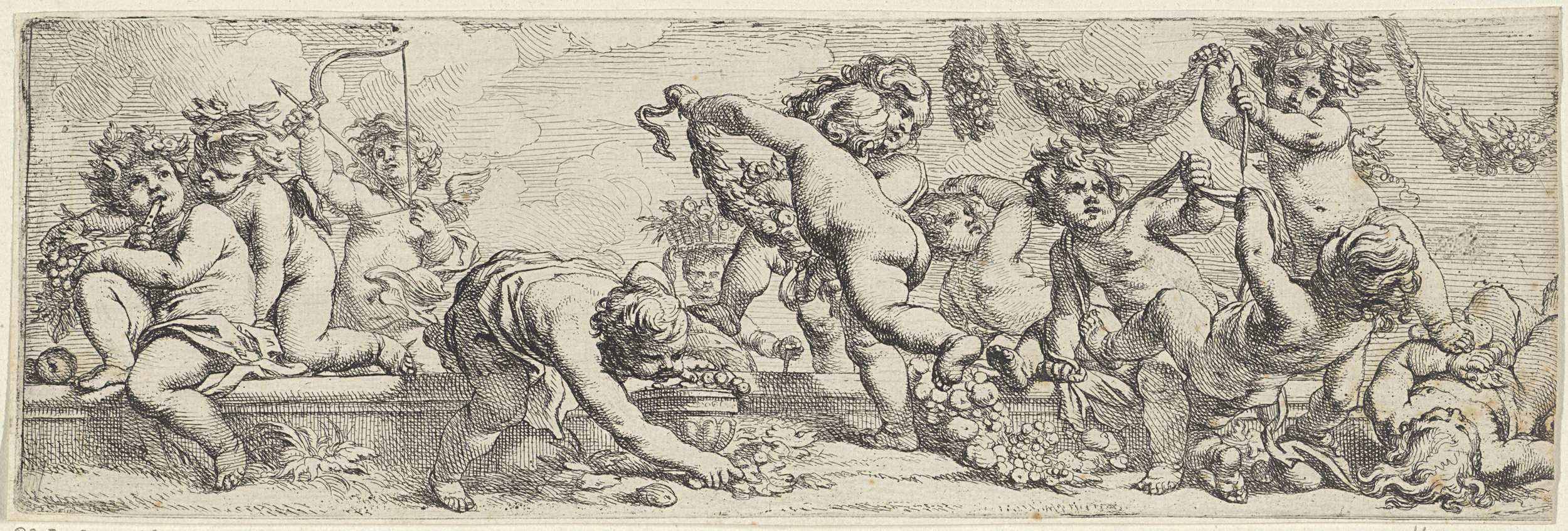 Fries met negen naakte, spelende kinderen. Zij houden guirlandes en banderollen vast. Links drie putti: een met pijl en boog en een met een fluit.