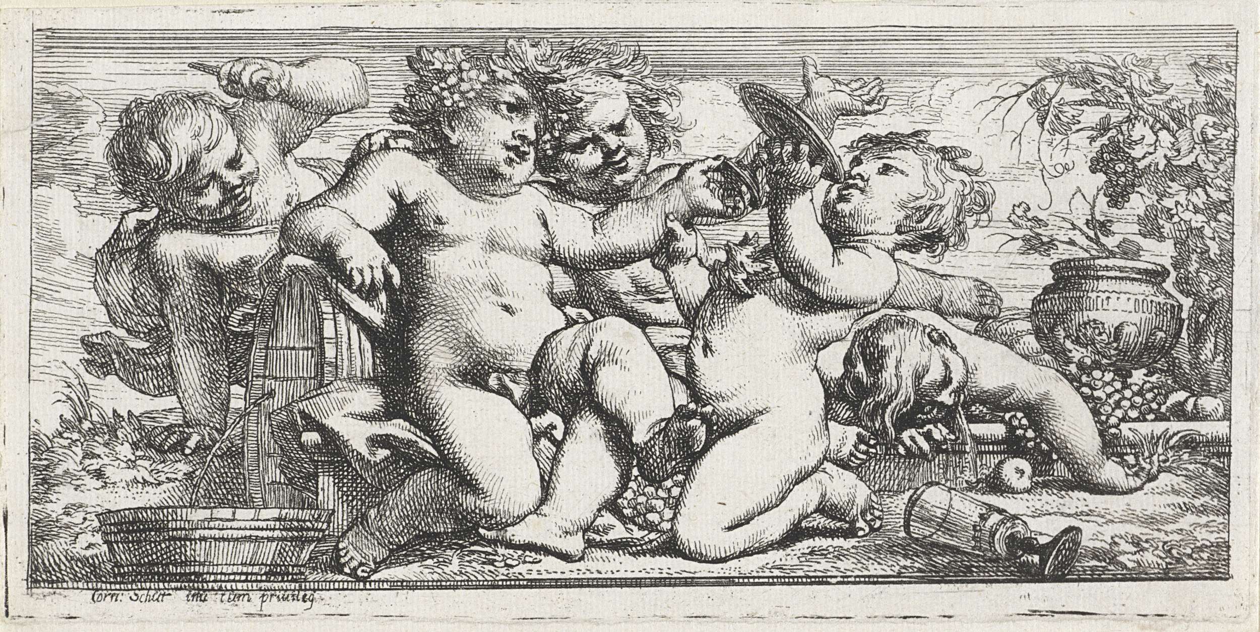 Vijf dronken kinderen doen zich tegoed aan wijn. Het kind links trekt de stop uit een wijnvat. Het kind met de drinkschaal, dat steunt op het wijnvat, stelt Bacchus voor. Een kind op de achtergrond ligt over te geven. Zijn wijnglas is op de grond gevallen.