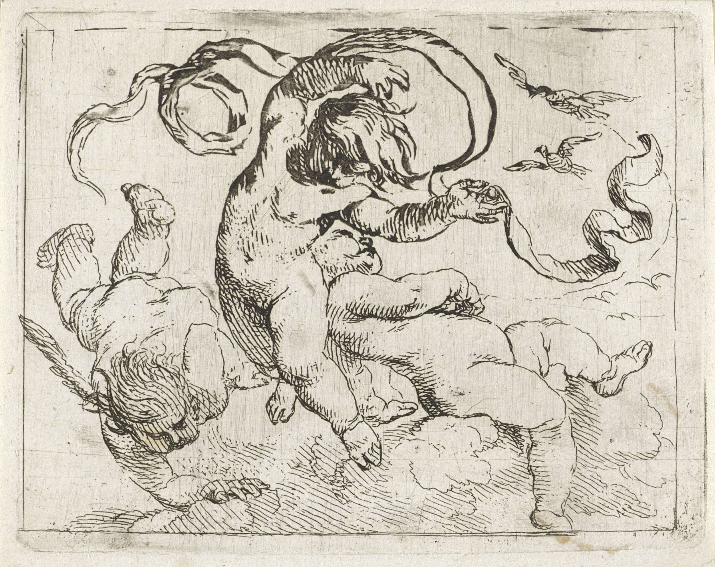 Drie vliegende putti met banderollen