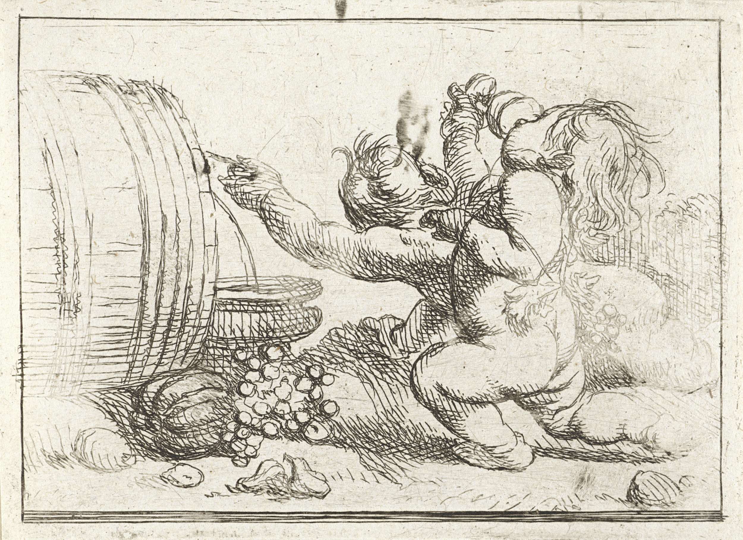 Twee kinderen doen zich tegoed aan wijn die ze uit een vat tappen.