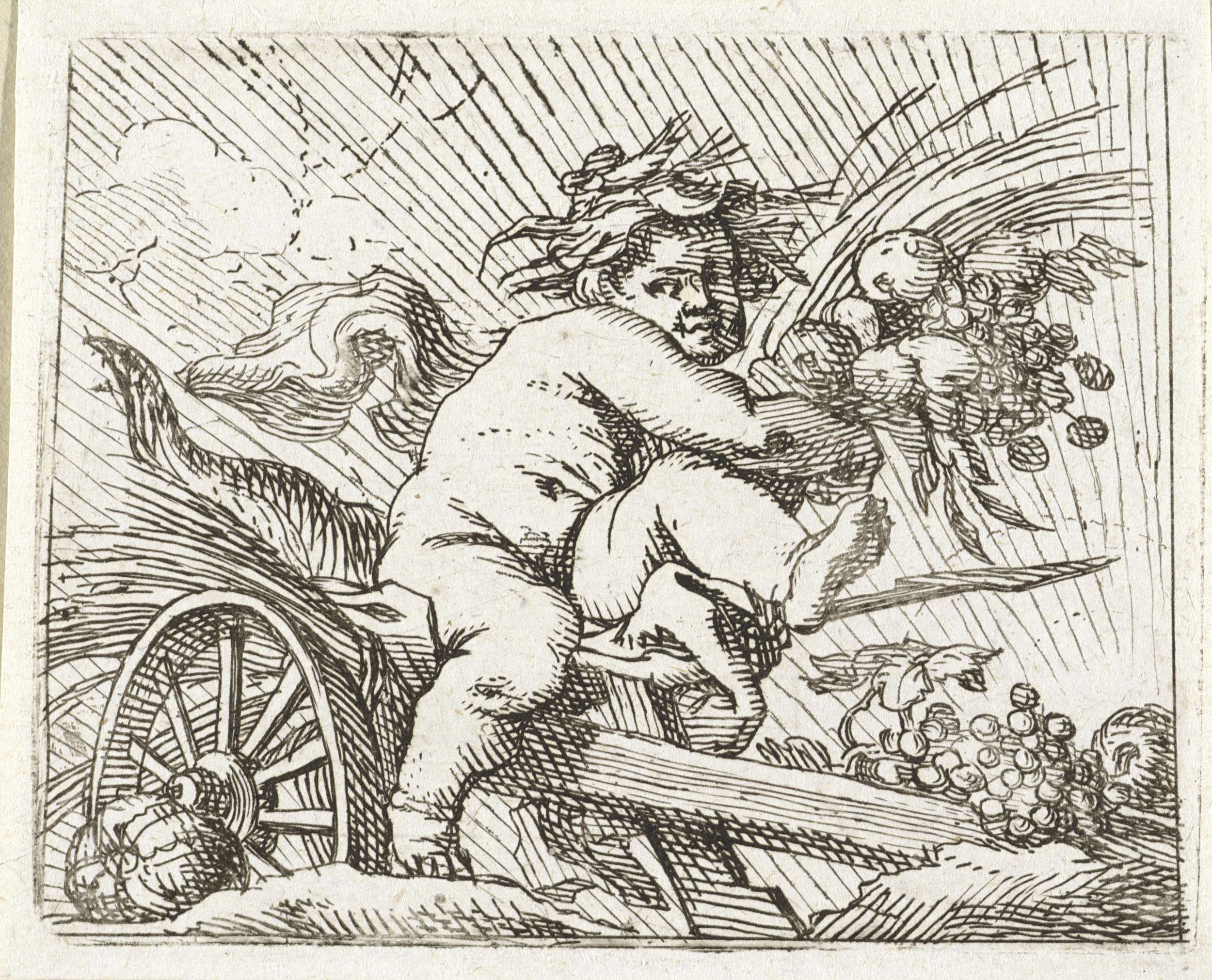 Een kind met zijn armen vol graanhalmen en fruit rijdt op een ploeg door de wolken.