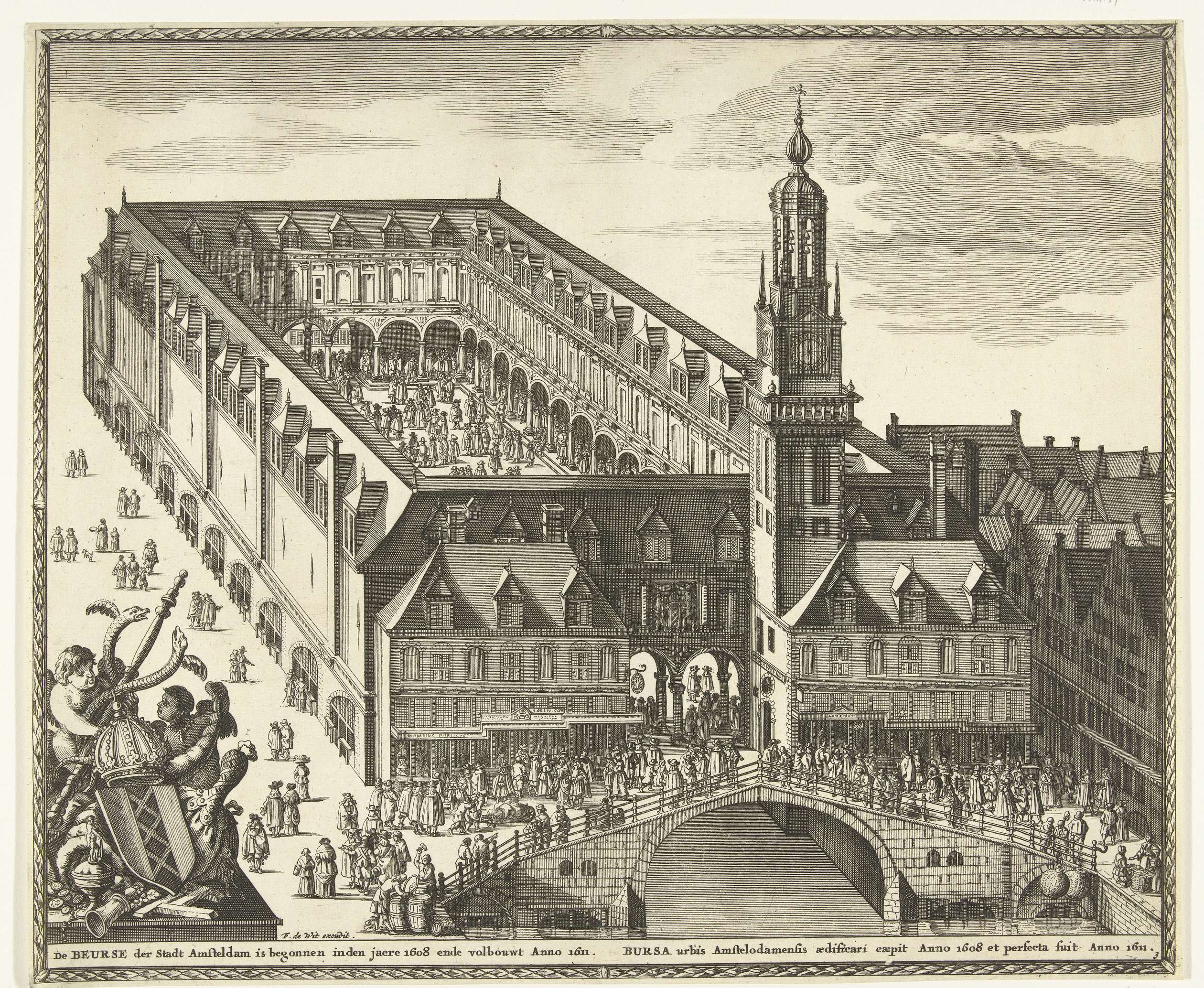 Vogelvluchtgezicht op de Beurs van Hendrik de Keyser te Amsterdam, voor de verbouwing van 1668. In en om het gebouw vele figuren. Linksonder het wapen van de stad met daaromheen twee putti met een caduceus, een hoorn des overvloeds waar kostbaarheden uit vloeien en een geldbeurs. Rechtsonder genummerd: 3.