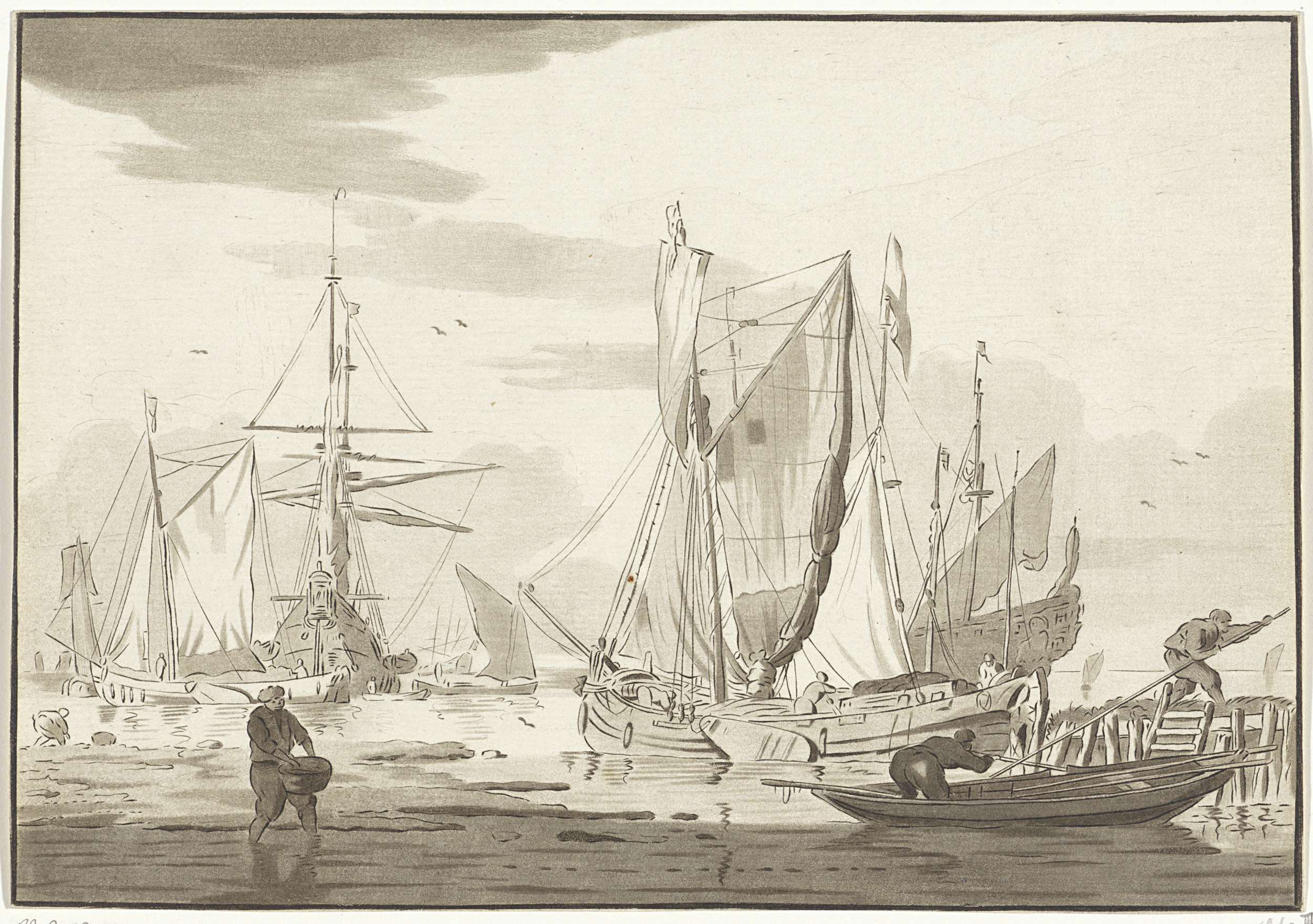 Schepen voor de kust. Links een man met een mand in zijn handen.