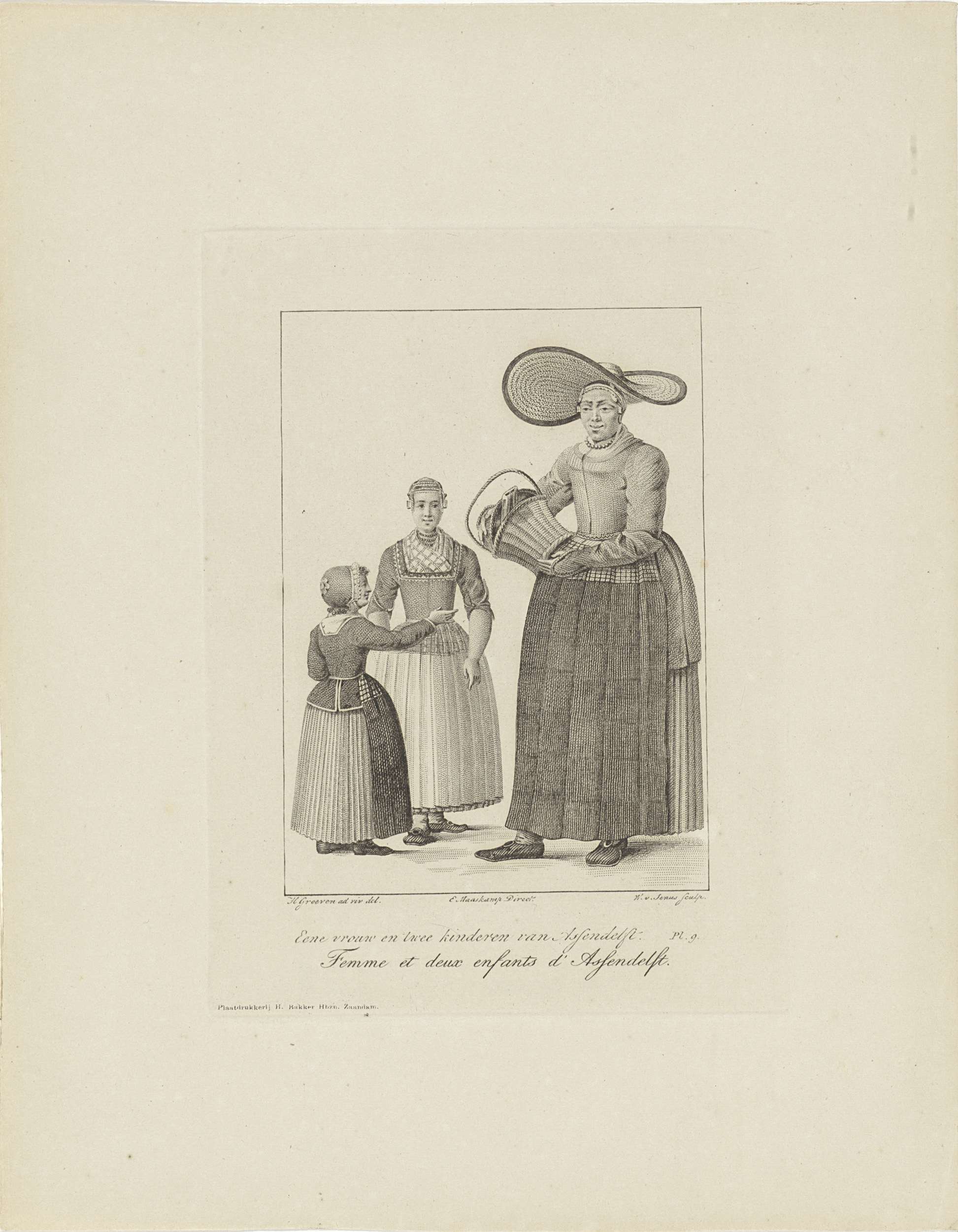 Een vrouw met een mand en twee kinderen in klederdacht uit Assendelft. Rechtsonder: Pl. 9.