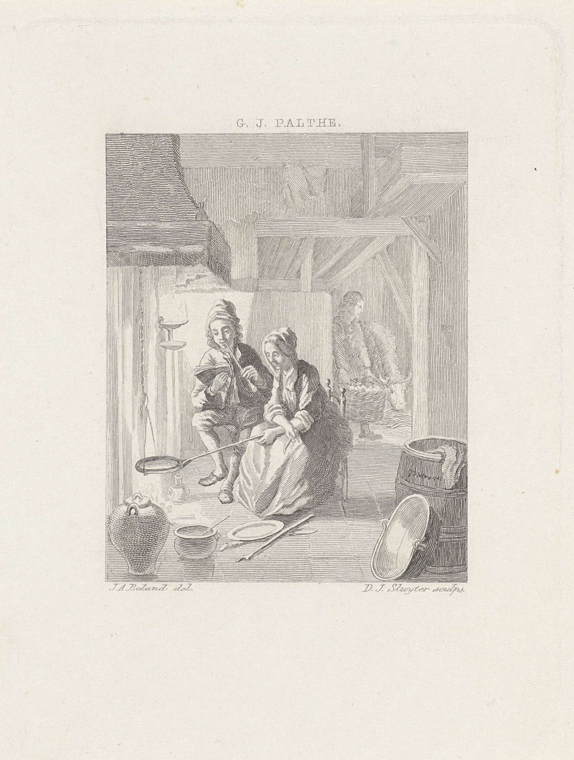 Een man en een vrouw zitten bij een brandende haard. De man rookt een pijp en leest een boek. De vrouw bakt koeken in een pan die zij boven het vuur houdt. Op de achtergrond een doorkijkje naar de stal met een koe en een man die een mand draagt.