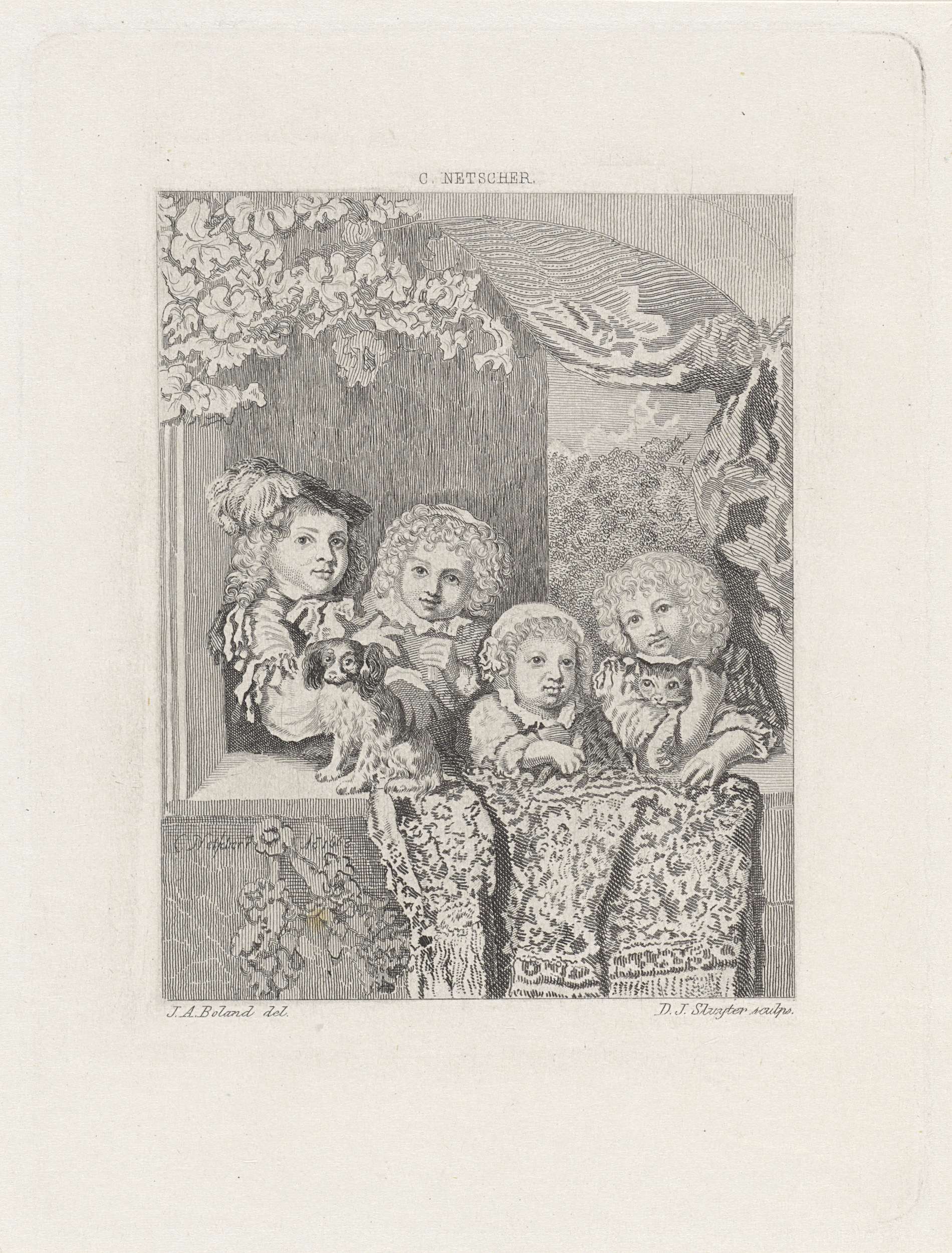 Vier rijkgeklede kinderen met een hond en een poes kijken in een tuin door een boogconstructie, waarlangs een wingerd groeit.