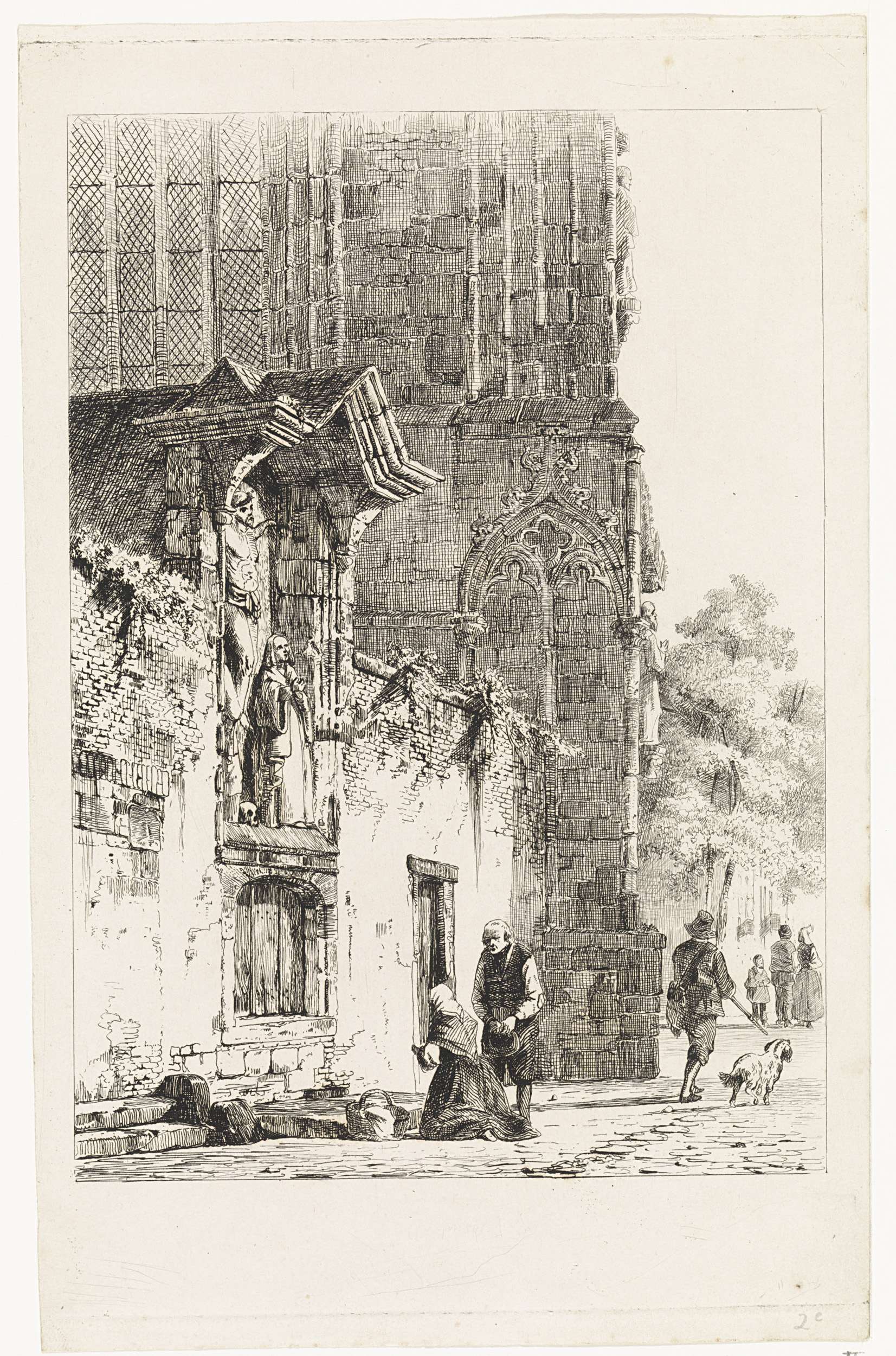 Een vrouw knielt voor een kappelletje, waarin een kruisbeeld hangt, aan de buitenzijde van een kerk. Een man staat met zijn hoed in de handen naast haar.