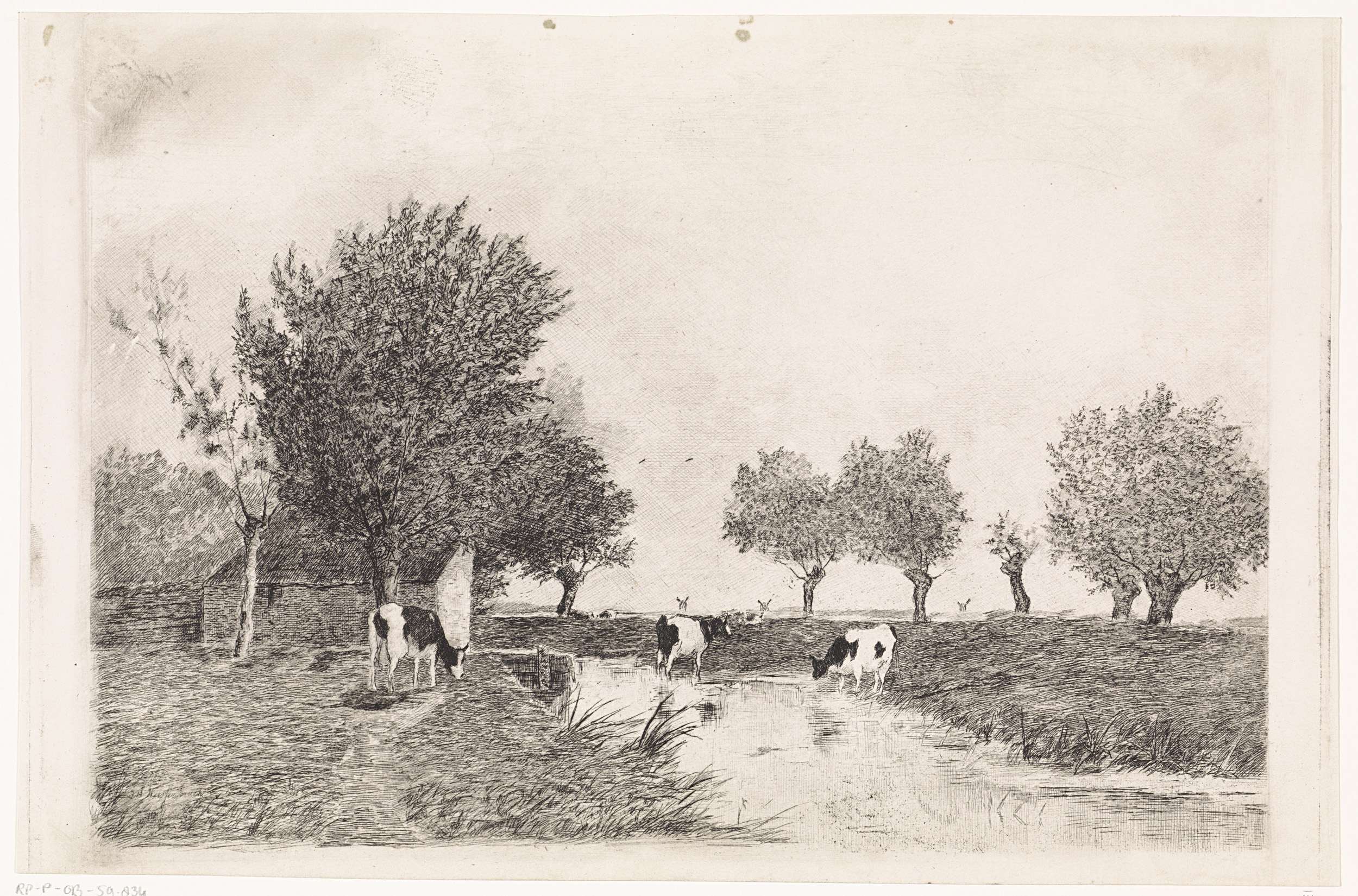 Landschap met drie koeien bij een sloot. Links een huis en aan de horizon drie molens.