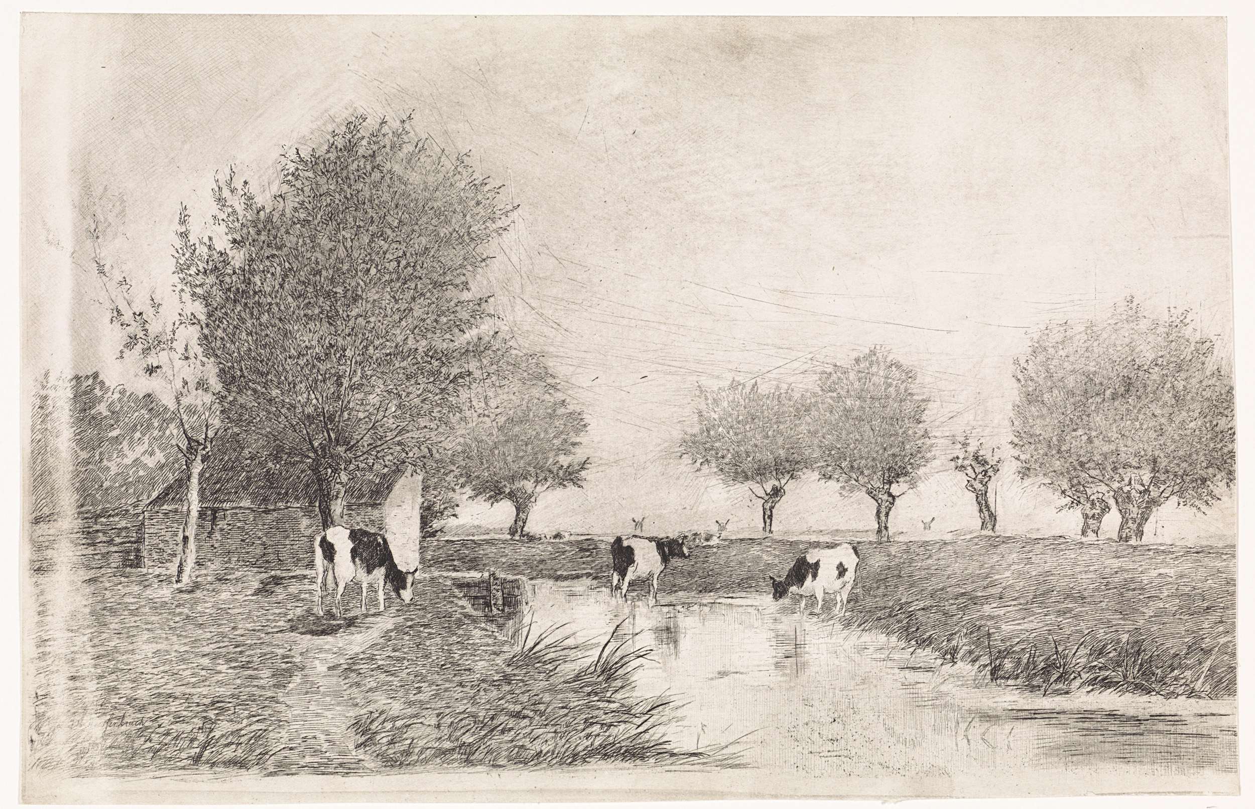 Landschap met drie koeien bij een sloot