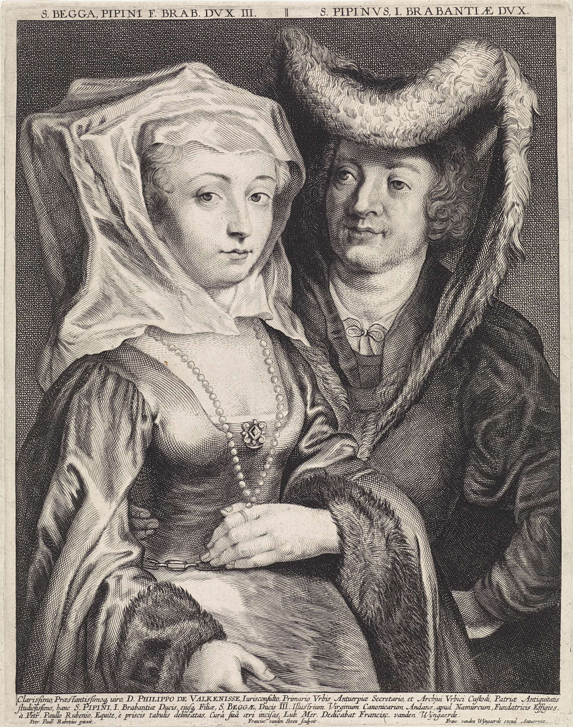 De heilige Begga staat naast haar vader Pepijn van Landen. Zij dragen Bourgondische hoofddeksels. Als weduwe stichtte Begga het klooster van Andenne.