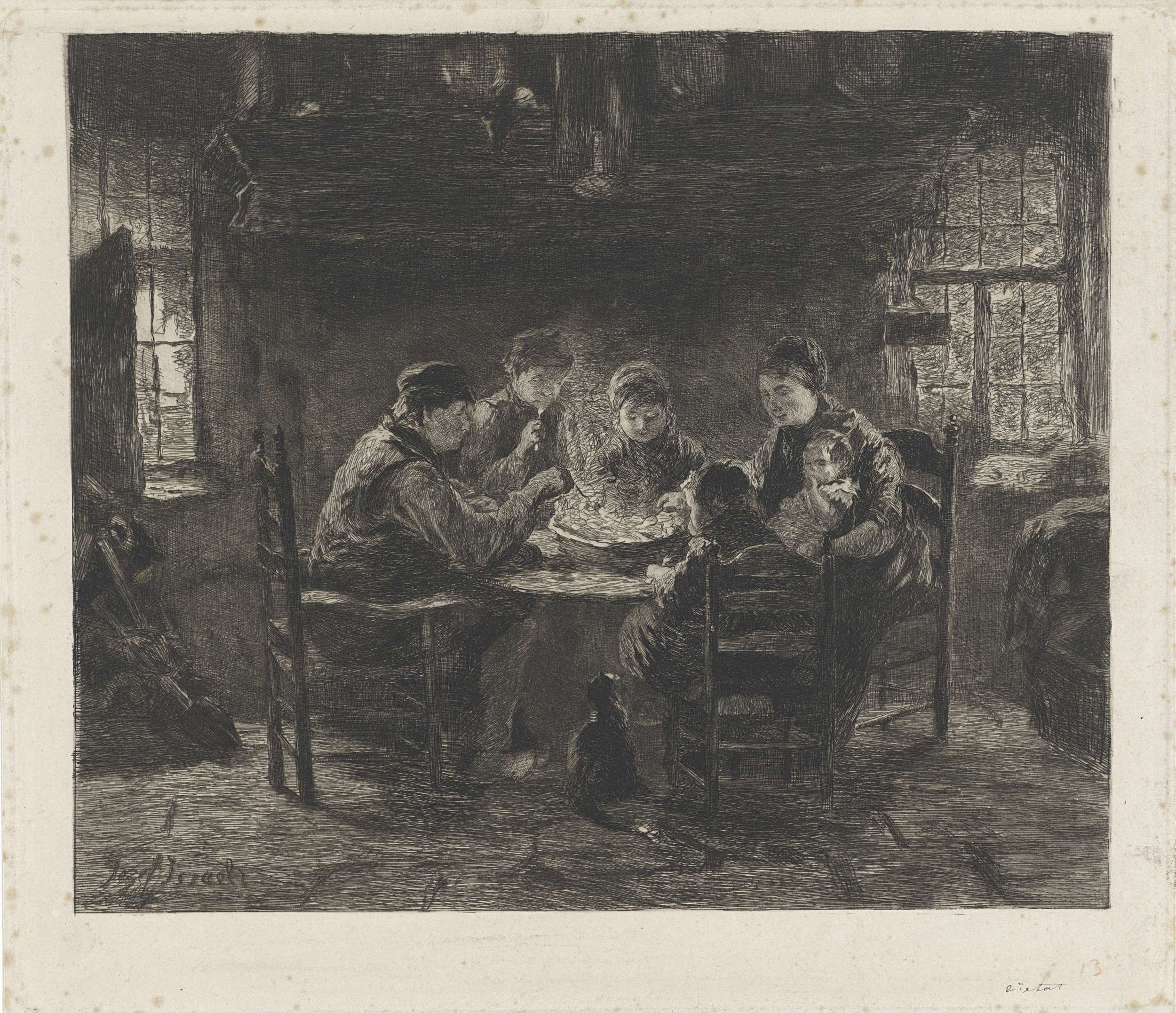 Een familie zit rond een tafel voor een maaltijd. Onder de tafel zit een kat.