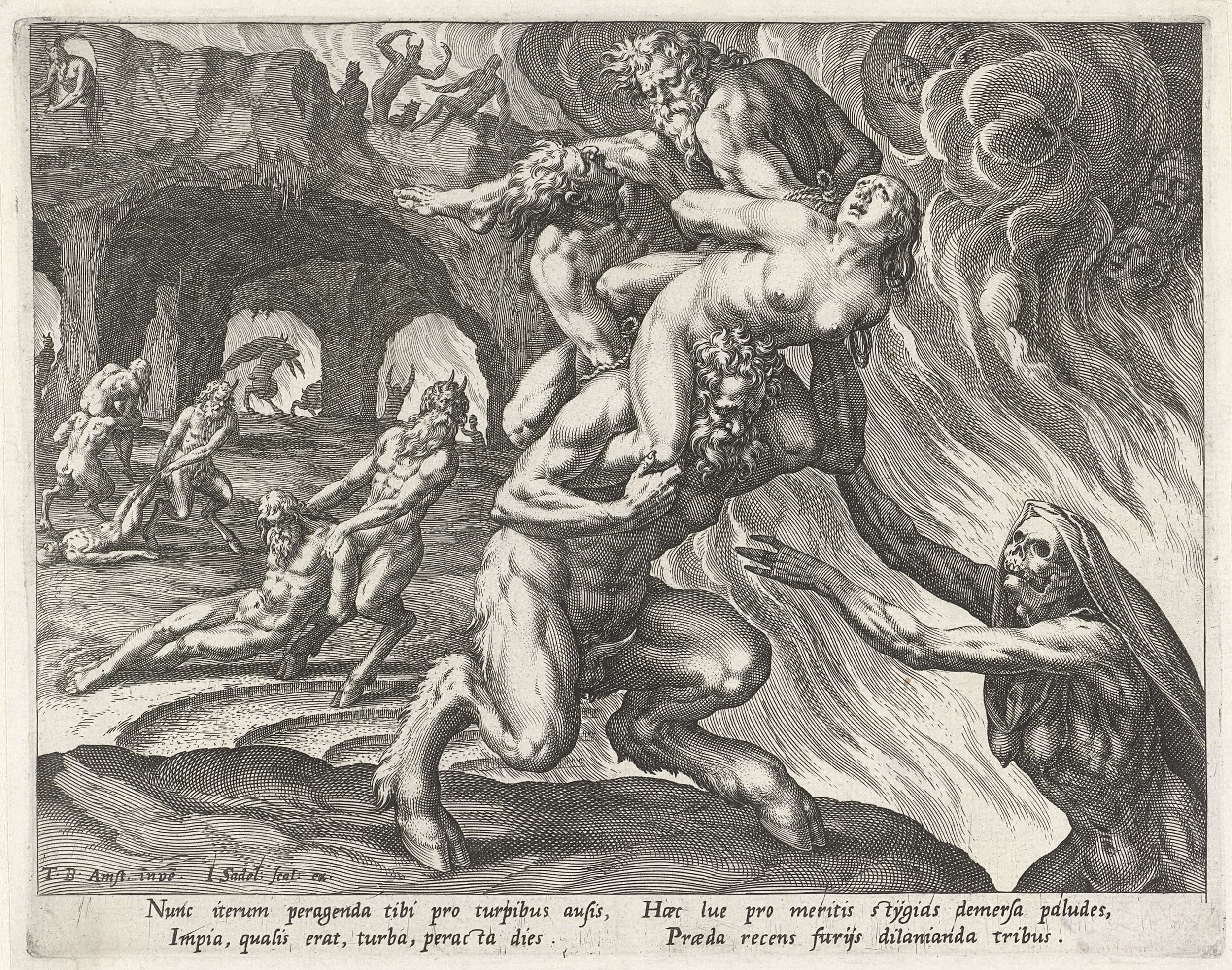 Duivels op bokkenpoten sleuren of dragen naakte mannen en vrouwen richting de vuren van de hel. De prent heeft een Latijns onderschrift en maakt deel uit van een vierdelige serie over de vier uitersten.
