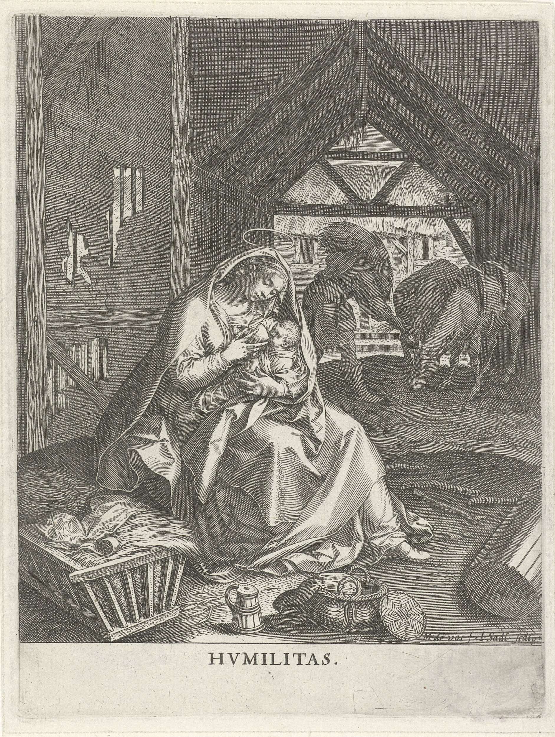 In een stal geeft de maagd Maria het Christuskind de borst. Naast haar de kribbe. Op de achtergrond voedert Jozef de os en de ezel. De eerste prent van een achtdelige serie met scènes uit het leven van Christus die zijn belangrijkste deugden verbeelden.