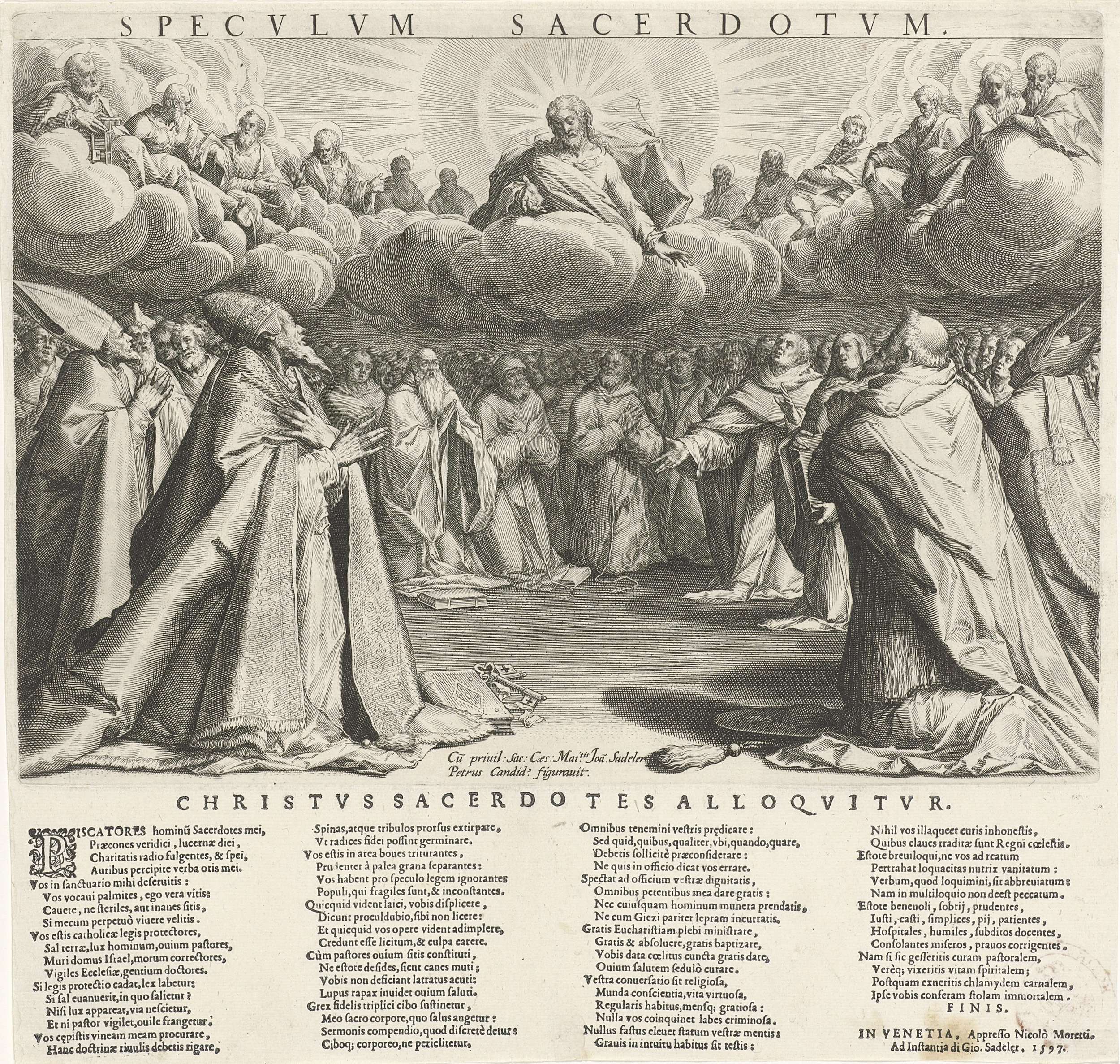 De katholieke geestelijkheid (met onder andere de paus, de kardinalen en de bisschoppen) knielt voor de verschijning van Christus in de hemel. Rondom Christus in de wolken de twaalf apostelen. De prent heeft een Latijns onderschrift over hoe het leven van Christus kan dienen als model voor het aardse leven.