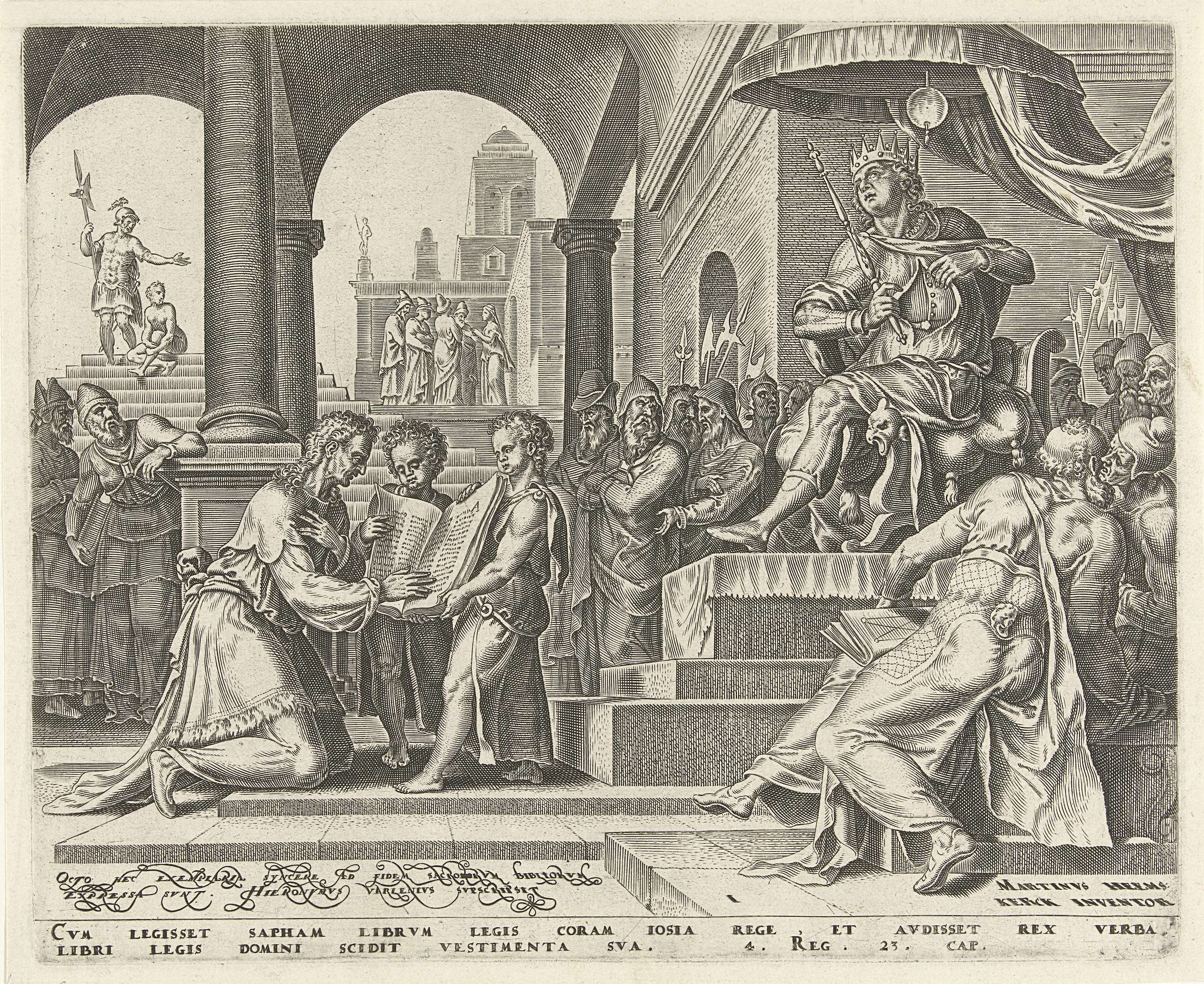 Koning Josia zit op zijn troon omgeven door leden van het hof. Voor hem knielt de hofschrijver Safia die hem voorleest uit een groot boek dat vastgehouden wordt door twee jongetjes. Bij het horen van de woorden van Safia scheurt de koning zijn mantel.
