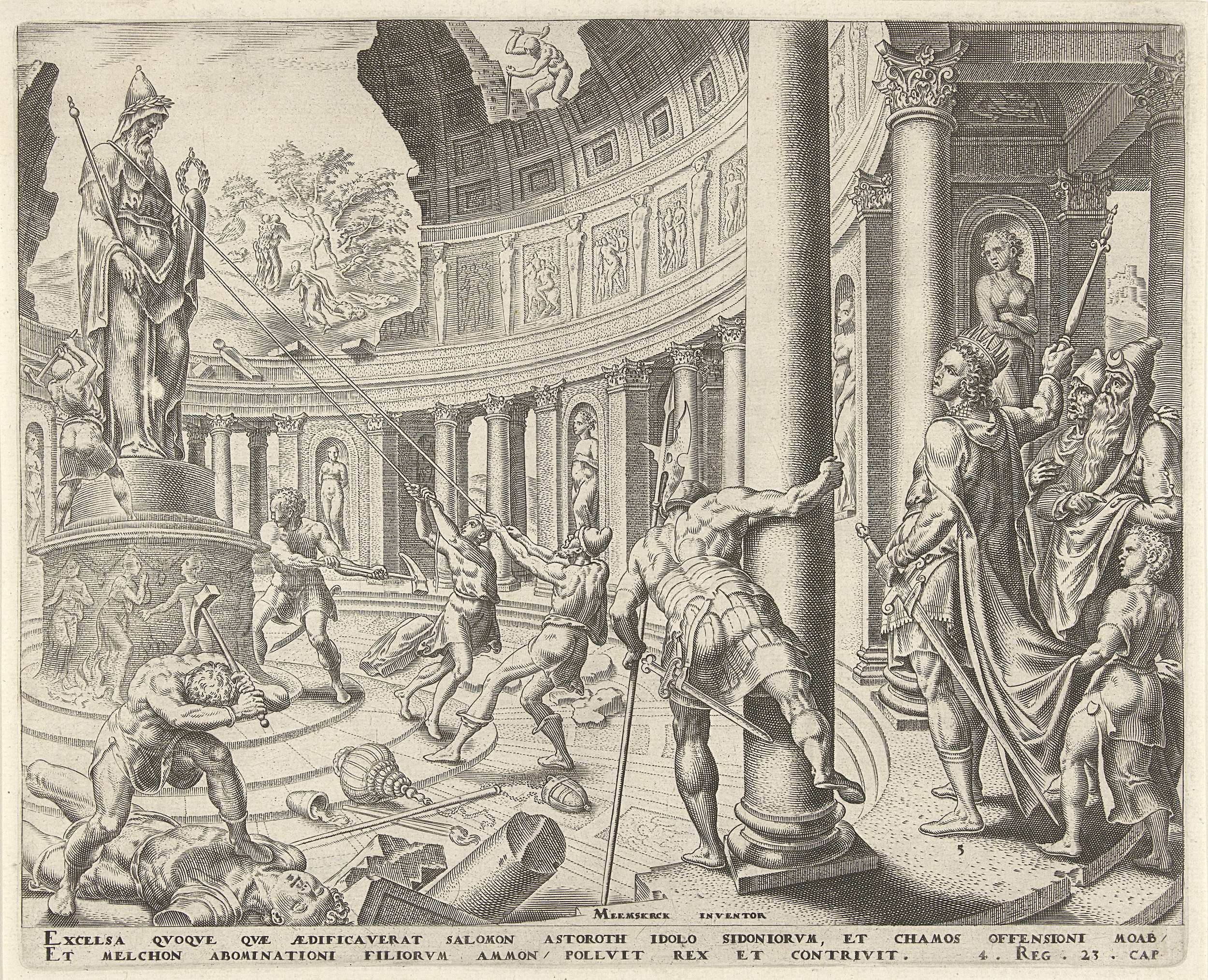Koning Josia laat de tempels ter ere van de heidense goden Astarte, Kemos en Milkom verwoesten en alle beelden van de afgoden in stukken slaan. Twee mannen zijn bezig om een groot standbeeld van zijn sokkel te trekken. Andere mannen slaan met hamers de tempel aan stukken.