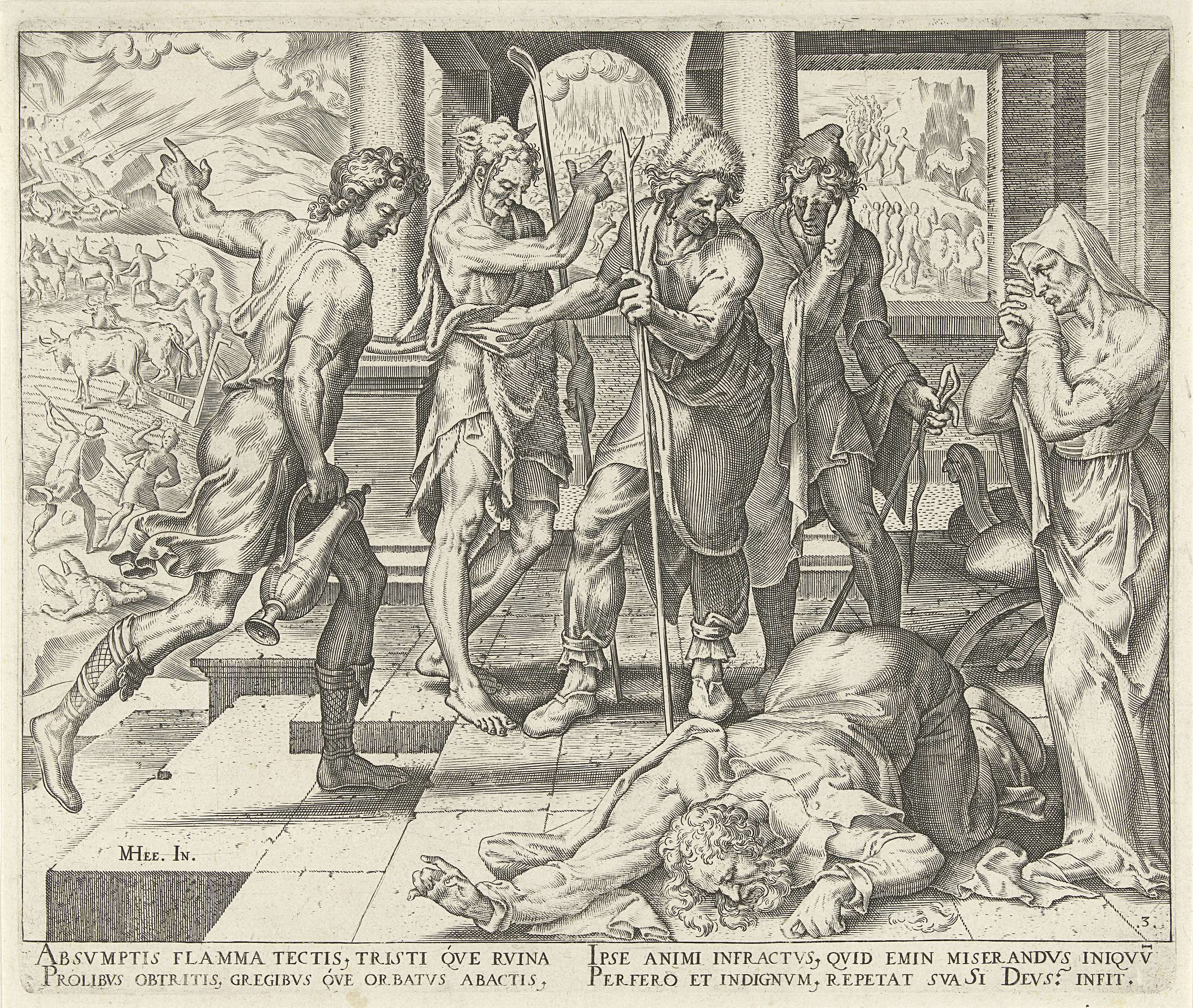 Vier boodschappers komen bij Job om hem te vertellen dat zijn kuddes zijn geroofd en door de bliksem getroffen en dat zijn huis is ingestort en zijn kinderen onder het puin bedolven zijn. Nadat Job het slechte nieuws heeft gehoord van de boodschappers verscheurt hij zijn kleren en valt hij neer op de grond.