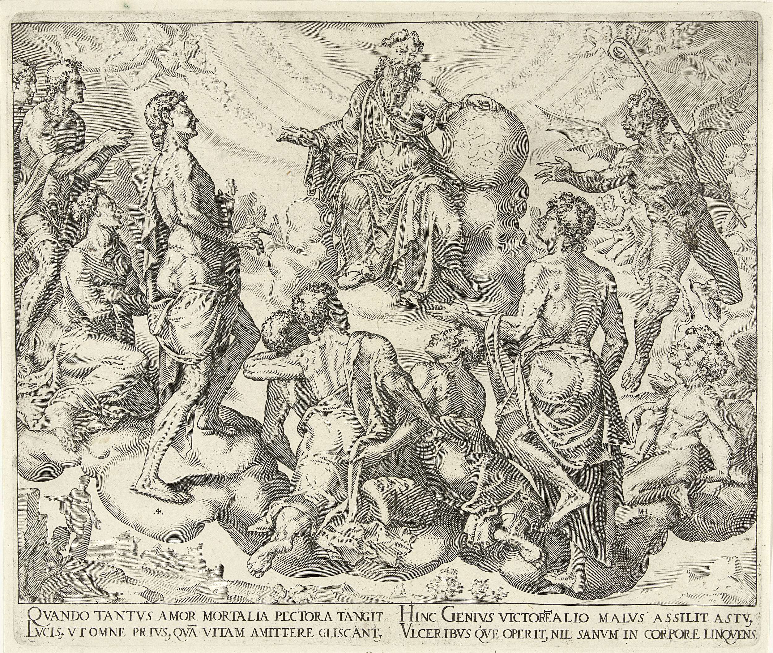 God troont op een wolk een globe naast zich. Om hem heen staan en zitten de overige hemelbewoners. Rechts Satan met vleugels en een dierenstaart. Satan daagt God uit om Job te beproeven.