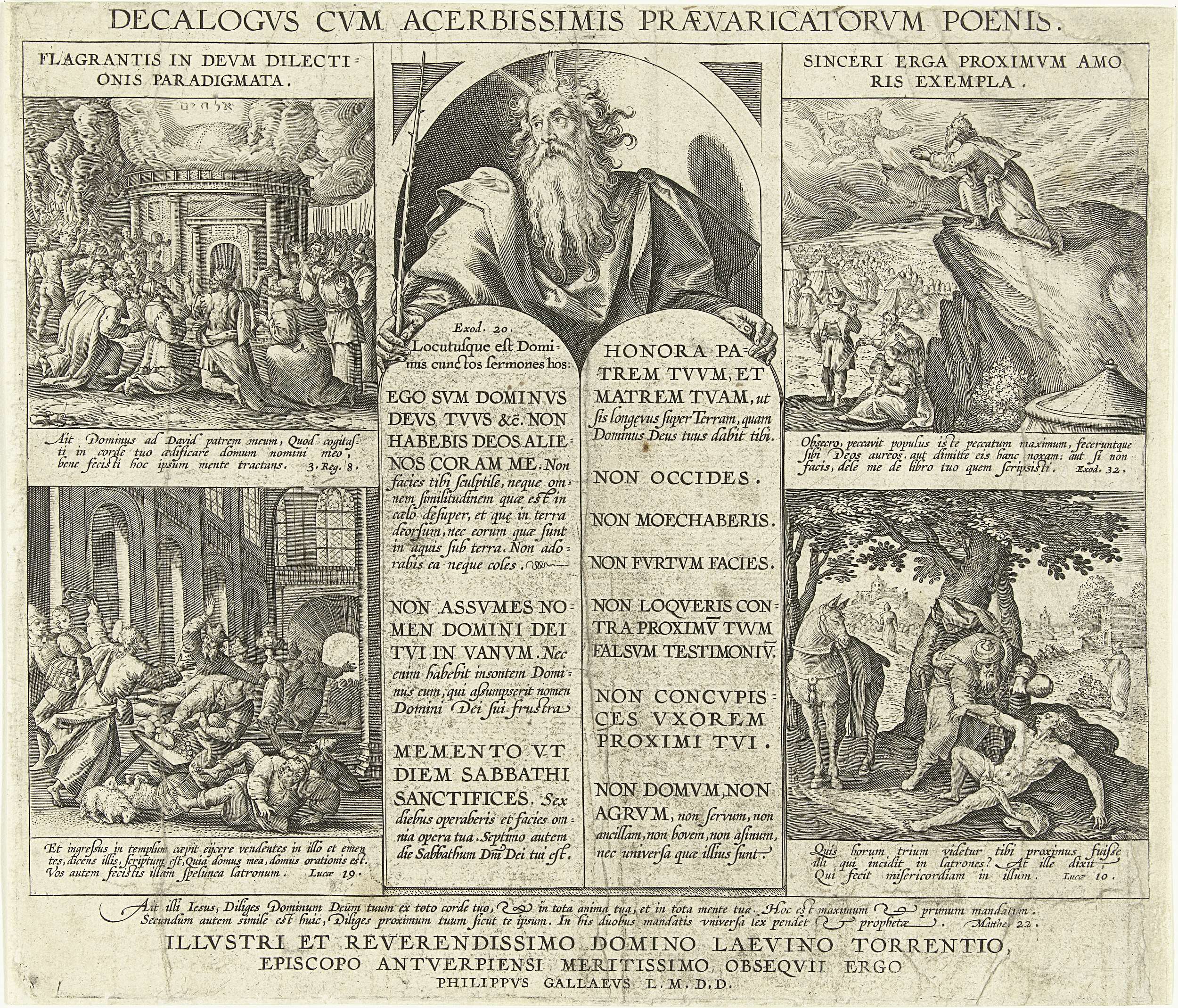 Mozes staat in het midden en houdt twee stenen tafelen vast met daarop de Latijnse versie van de Tien Geboden. Aan weerszijden van hem vier afbeeldingen. Bovenaan links koning Salomo's gebed tijdens de inwijding van de tempel (1 Koningen 8). Onderaan links verdrijft Christus de geldwisselaars uit de tempel (Lucas 19:45). Bovenaan rechts de verschijning ...