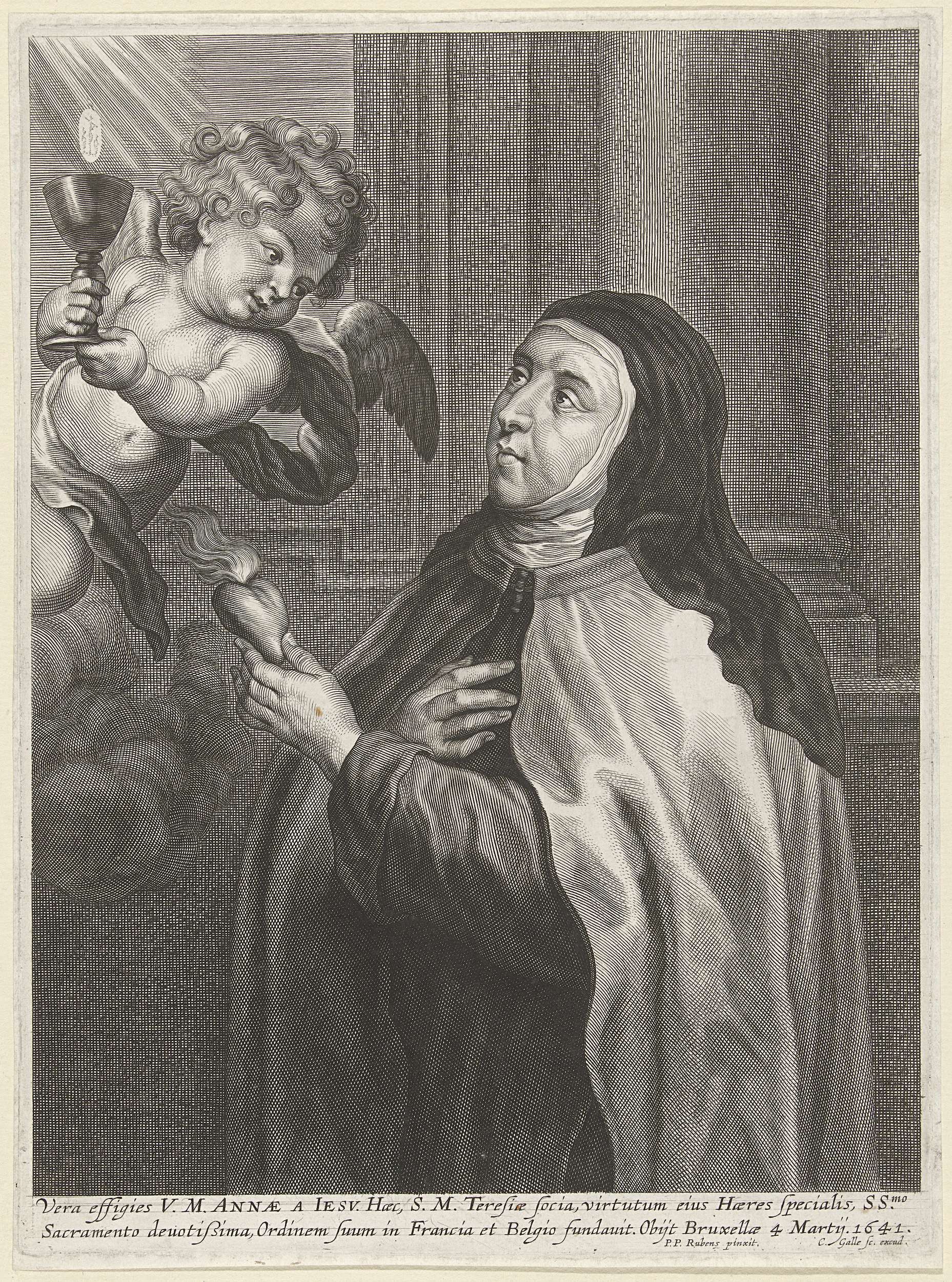 De heilige Anna van Sint-Bartolomeüs in het habijt van de karmelietessen. Een engel brengt haar een kelk met hostie. Anna houdt een brandend hart in haar hand.