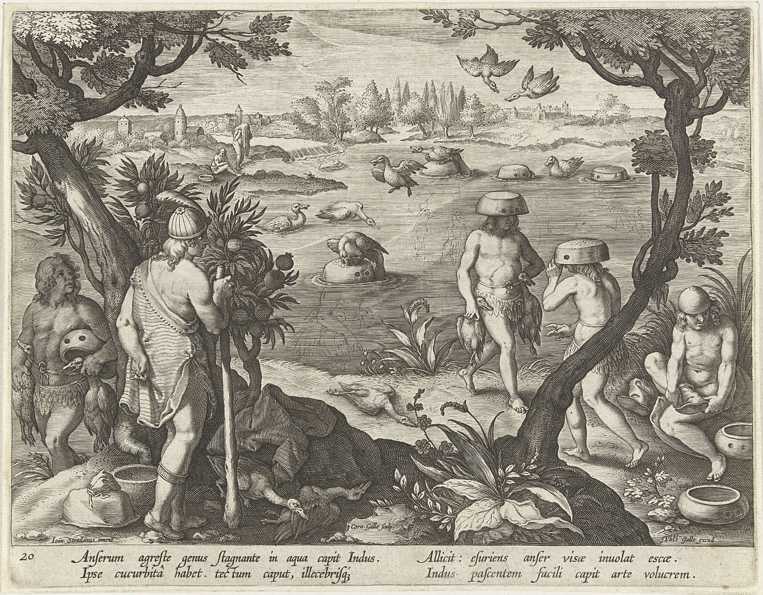 Oorspronkelijke Amerikanen vangen eenden in een vijver. Door middel van een uitgeholde pompoen camoufleren ze zichzelf en verbergen ze zich in het water. Wilde eenden gaan op de pompoenen zitten en zijn een gemakkelijke prooi. De prent heeft een Latijns onderschrift en is deel van een serie over jachttaferelen.