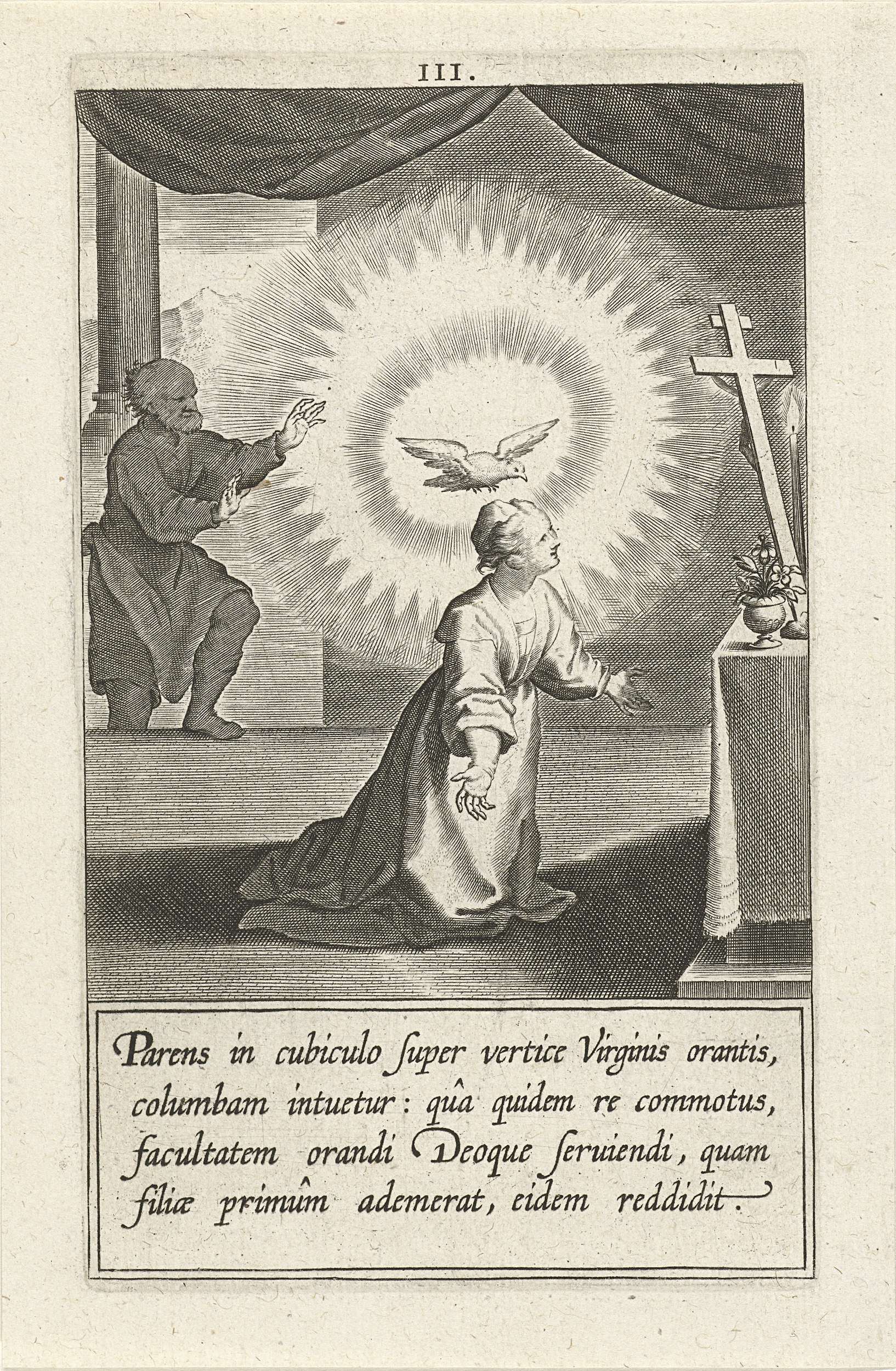 Tijdens Catharina's gebed zweeft een witte duif in stralenkrans boven haar hoofd. Haar vader die dit toevallig ziet is vanaf nu overtuigd van haar bijzondere status en oefent verder geen druk meer op haar uit om ze tot een huwelijk te bewegen. Deel van een serie over Catharina van Siena bestaande uit een titelprent, een ...