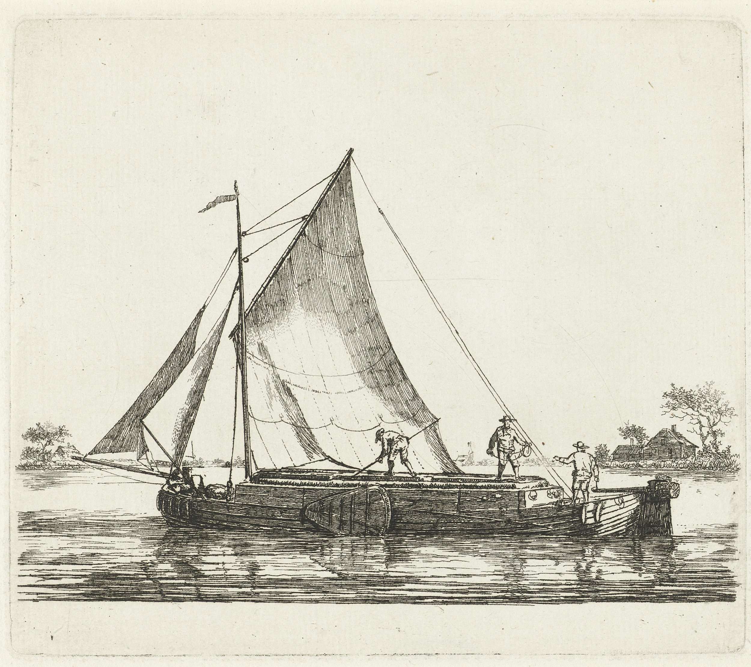 Turfschip met daarop drie mannen waarvan er één aan het roer staat. Rechts op de achtergrond een boerenhoeve en de contouren van een kerk. Deze prent maakt deel uit van een serie van twaalf prenten met verschillende zeilschepen.