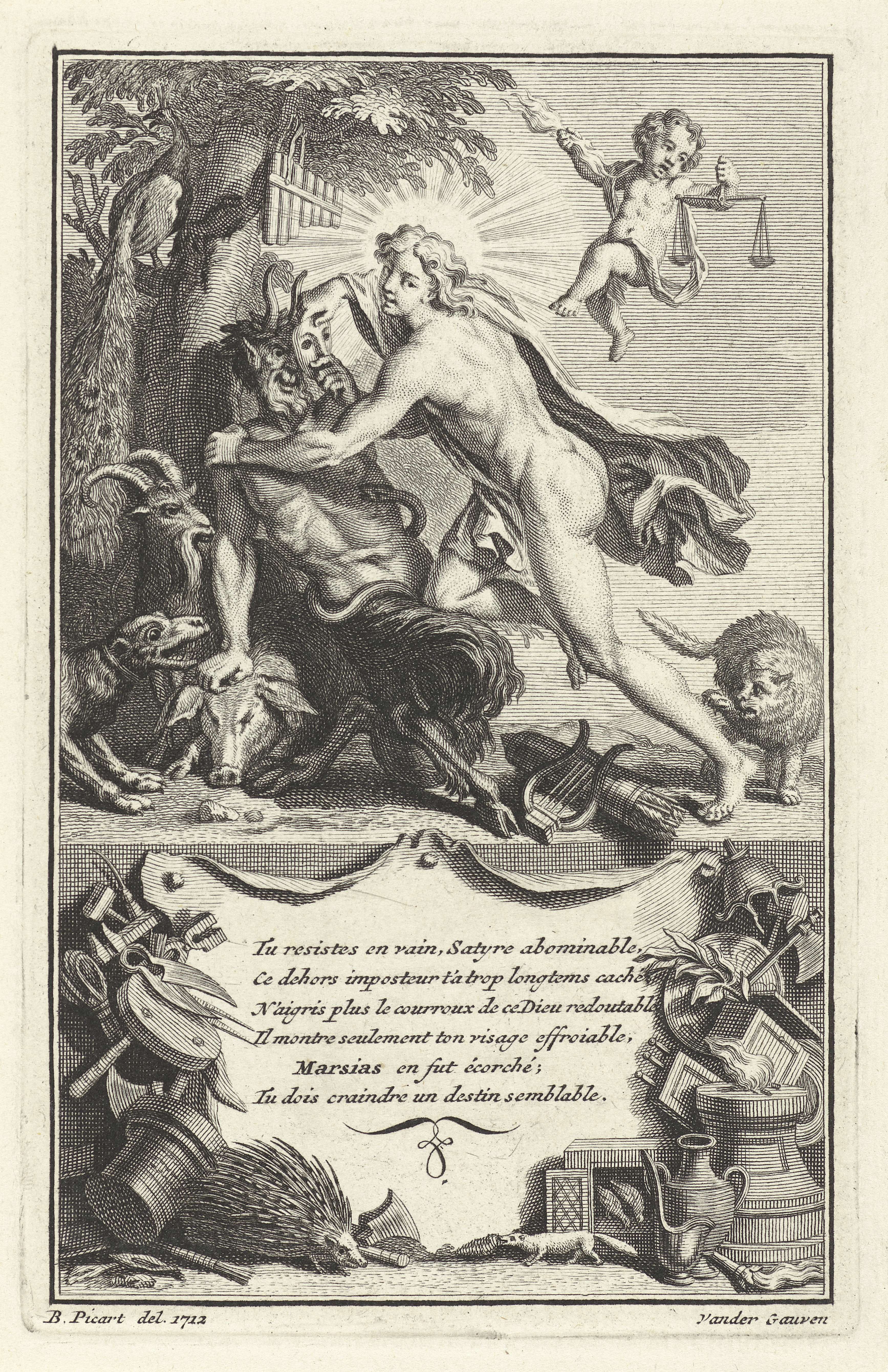 De god Apollo ontmaskert de sater Marsyan. Rondom hen allerlei dieren: een pauw, een hond, een geit een varken en een kat. In de lucht een putto met een weegschaal en een bliksemstraal. De prent heeft als onderschrift een Franse tekst in een cartouche.