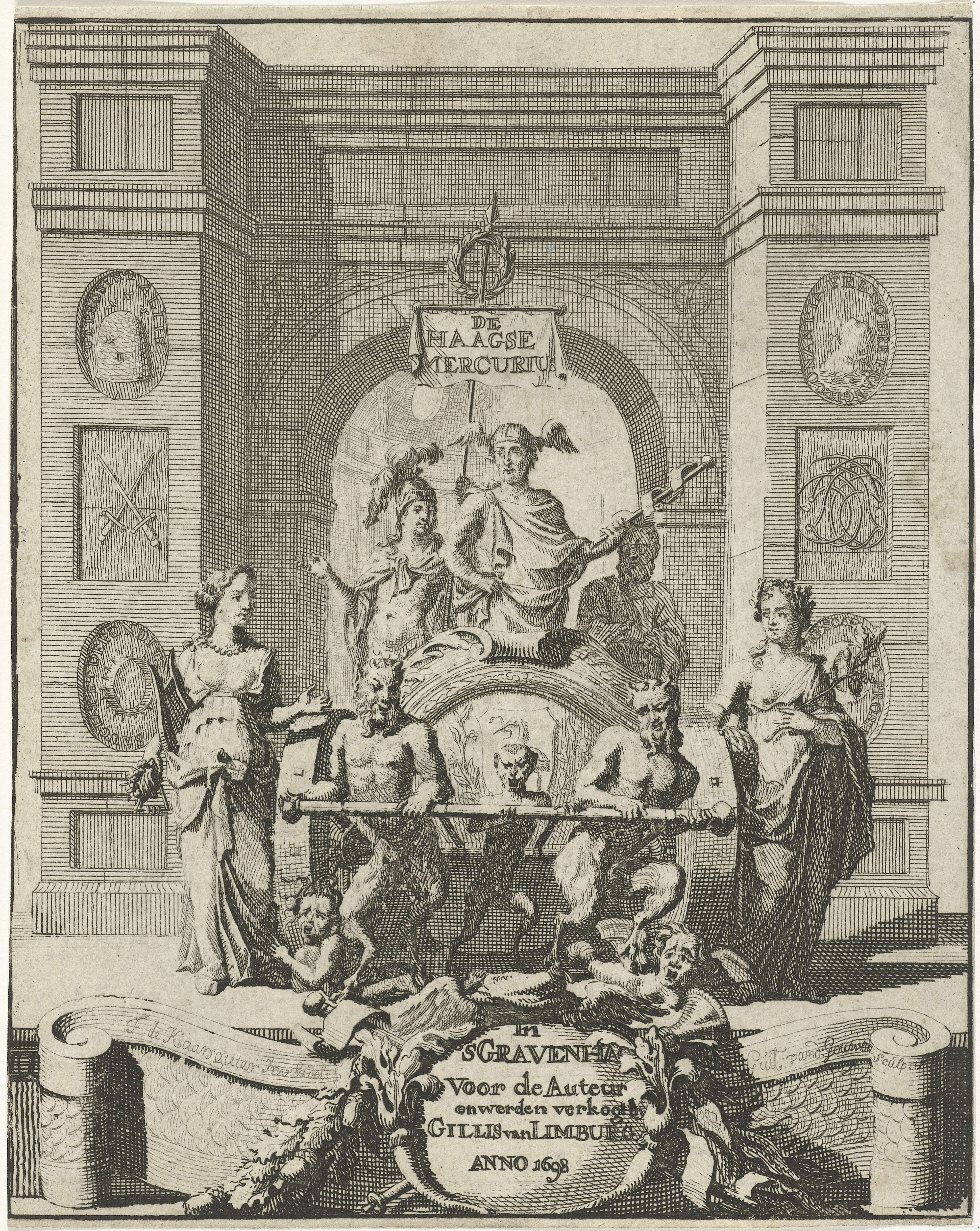 Voor een triomfboog de triomfwagen van Mercurius, getrokken door saters. Mercurius zit in de triomfwagen. Naast hem Minerva met een standaard waarop de titel van het boekwerk. Naast de triomfwagen de personificaties van muziek en dichtkunst.